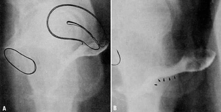 There are two arcus tendinei on each side of the pelvis. The arcus tendineus of the levator ani runs from the back of the pubis to the ischial spine (Fig. 4). Medial to this is the arcus tendineus of the endopelvic connective tissue. Although there is individual variation in the distance between these two arci at their origin and lateral extent, they come together at the ischial spine. There is a connective tissue bundle running between the anterior vaginal sulcus and the arcus tendineus (Fig. 5 and Fig. 6). The urethra is held in place by two systems. It is suspended by the urogenital diaphragm and its attachment to the pubis, and supported by the connective tissue attachment between the anterior sulcus and the arcus tendineus (Fig. 7). A hypermobile urethra may be surgically remedied either by suspension or by support or by both, depending on the site of primary damage that permitted the hypermobility. |