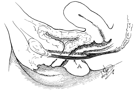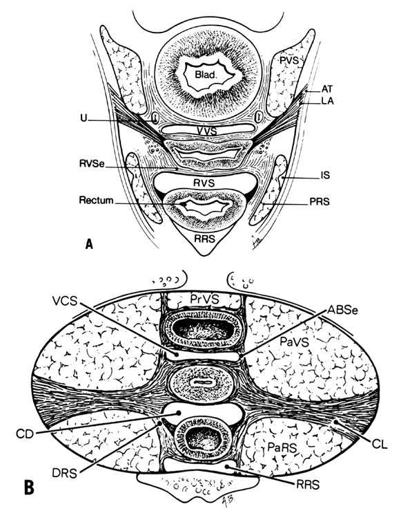 Much of the beauty of soft tissue pelvic architecture derives from the abilities of the organs of the three primary systems in this area—urinary, reproductive, and rectal (gastrointestinal)—to function independently of one another. Each is capable of the limits of its normal range of function without permanent alteration of the anatomy or function of its neighbors, the organs are capable of independent expansion and contraction. There are connective tissue spaces between these organs that permit this relatively independent function.25 These spaces are divided by connective tissue septa that not only afford mechanical support but also provide the physical routes of blood vessels, lymphatics, and nerve tissues to and from the pelvic organs. These structures are contained within the septa along reasonably constant routes and do not trespass on the connective tissue spaces. Although their location is quite regular within the septa, individual variations as to the site of origin and their relative size are occasionally seen. The anatomic ligaments form natural barriers to the spread of infection, cancer, and hematomas. The septa, on the other hand, through their blood vessels and lymphatics, form natural routes for the transmission of infection and malignancy arising from the pelvic organs. A detailed knowledge of the anatomy of these spaces and partitioning septa is essential to the understanding of their actual and potential functional importance in both health and disease. From accurate knowledge and experience, the surgeon can know not only where to find major vessels and so avoid unnecessary blood loss but also how to avoid unnecessary surgical penetration of adjacent organs. To the oncologic surgeon, this anatomic knowledge helps to demarcate the likely limits and routes of direct spread of malignant disease and to determine the extent of necessary extirpation. To the surgeon concerned with pelvic reconstruction, the implications are obvious in the need to reestablish original relationships between the organs. The connective tissue capsules or adventitia of the bladder, birth canal, and rectum are attached to the pelvis, and at certain points to one another, by condensation of connective tissue that contain the principal blood vessels and lymphatics to and from these organs. Although these septa vary in strength and thickness from person to person, their relation and position are constant. Potential spaces exist between these septa, and the spaces are filled with fat and loose alveolar tissue but are essentially free of blood vessels and lymphatics (Fig. 12, Fig. 13, Fig. 14). These areas become actual spaces only by dissection, but this is easily accomplished bloodlessly and bluntly once access to the space has been gained by surgical penetration through a septum. Safe extirpative or reconstructive surgery for benign pelvic disease requires identification, penetration, and invasion of the midline anterior and posterior spaces, but the oncologic surgeon requires penetration and dissection of the lateral spaces as well. Vesicovaginal Space The vesicovaginal space lies in the midline and is bounded anteriorly by the bladder adventitia, laterally by the bladder septa, or pillars, and posteriorly by the adventitia of the vagina. Superiorly it ends at the point of fusion between the adventitia of the bladder and vagina. This point of fusion is called the supravaginal septum or vesicocervical ligament.27 From our dissections we have found that this point of fusion occasionally contains multiple fasciculi, oriented in the same general direction but occurring at slightly different levels (Fig. 15). Inferiorly, the vesicovaginal space is limited by the fusion of the urethral and vaginal adventitia. Supravaginal Septum Anterior entry between the vagina and the peritoneal cavity is often through anatomic areas somewhat different, depending on whether the approach is from the vaginal or from the abdominal side. This structural difference may help explain why the surgeon who customarily operates by the abdominal route may experience unexpected difficulty in separating bladder from cervix when he approaches a hysterectomy vaginally; similarly, the surgeon who is more comfortable with performing a hysterectomy through the vagina may wonder why unfamiliar difficulty may arise during the course of abdominal hysterectomy. This anatomic difference may be explained in Figure 15. A customary route of dissection is identified by the arrows. The vaginal operator may incise directly through the point of fusion between the bladder and the vagina, providing ready access to the anterior vesicouterine perineal fold. When this is not promptly evident, the physician may well have carried this dissection beneath the connective tissue capsule of the uterus, well above the anterior peritoneal reflection, and succeeded in peeling the peritoneum along with this uterine connective tissue capsule from the anterior surface of the uterus. The abdominal operator, on the other hand, will incise first directly into the anterior peritoneum, continuing the dissection beneath the connective tissue capsule of the uterus beneath or through the so-called supravaginal septum to the vagina. The former is the essence of the so-called endofascial hysterectomy. Recognizing these differences and becoming comfortable with both techniques will provide valuable surgical experience and enable one to find the anterior vesicouterine peritoneal fold when operating through the vagina, as well as finding the longitudinal muscle layer of the vagina more safely when operating for benign disease through a transabdominal approach. That the connective tissue capsule of the vagina is continuous with that of the bladder is seen in the accompanying photomicrograph (Fig. 16) in which the sagittal section had been obtained postmortem through the vagina, cervix, and bladder of an aging patient with procidentia. Notice the continuity of this layer which mu