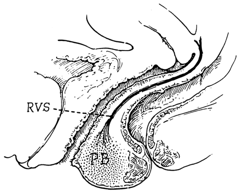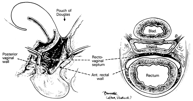 The perineal body is a fibromuscular elastic structure found in the midline between the rectum and the vagina on a line between the ischial tuberosities; it contains much elastic tissue. It is subject to individual variation in tone, thickness, and composition. It is somewhat like the hub of a wheel into which various muscles—the superficial and deep transverse muscles of the perineum, the bulbocavernous muscle, the sphincter ani externus, and some fibers of the levator ani—are inserted like spokes. It is bounded anteriorly by the vagina and posteriorly by the rectum. Studdiford7 found considerable smooth muscles in the perineal body serving as a distensible attachment to the levator ani and to the vagina. He felt this distensibility was an important function which, when lost through unrepaired perineal laceration, gave rise to rectocele and posterior vaginal eversion. The apex of the perineal body is continuous with the rectovaginal septum (the fascia of Denonvilliers), as shown in Fig. 3. When this attachment is avulsed, the weakness thus created favors the formation of a low or mid vaginal rectocele. The apex of the perineal body must be reattached to the underside of the posterior vaginal wall and rectovaginal septum by separate stitches to lessen the chance of recurrence of the rectocele. Ranney8 pointed out that the perineal body is not a keystone, since its wide base points down, not up, and that such a keystone, by its very nature, would fall down if pressure were applied to it. Blood Vessels of the Female Perineum The blood supply to the perineal structures is derived from the branches of the internal pudendal artery, which arises from the anterior trunk of the internal iliac, leaves the pelvic cavity through the greater sacrosciatic foramen, passes around the ischial spine, and enters the perineum by means of the lesser sacrosciatic foramen. As it ascends along the pubic ramus, it pierces the posterior layer of the urogenital diaphragm, travels for a short distance within the diaphragm and perforates the anterior layer, and gives off its terminal branches—the artery to the bulbocavernous muscle and the dorsal artery of the clitoris. The branches given off by this large vessel within the perineum include the external or inferior hemorrhoidal arteries given off as the vessel rises anterior to the ischial tuberosity. The external hemorrhoidal arteries run across the ischiorectal fossa and are distributed to the anal sphincter and levator ani muscles. They are the chief sources of hemorrhage from all superficial wounds of the anus or ischiorectal fossa. These vessels have accompanying veins that empty into the pudendal veins. The superficial perineal or vulvar artery is given off anterior to the preceding branch. It is distributed to the vulva, with branches to the muscles, and is a source of arterial hemorrhage in wounds of the vulva. The transverse perineal artery is somewhat smaller, supplies the cutaneous surface of the perineum, and is therefore a source of hemorrhage from laceration of the perineal body. The fourth branch is the artery of the bulb, a vessel of considerable diameter but of short length. It sends branches to the bulbocavernous muscle. The terminal branches of the internal pudendal artery, the artery of the corpus cavernosum, and the dorsal artery of the clitoris are the supplying vessels of the erectile tissue of the clitoris. When the clitoris is amputated, the two dorsal arteries may require ligation. Bleeding from the vessels of the corpora cavernosa can usually be controlled by pressure, since the trabeculae favor coagulation of the blood. The veins of the perineum are valveless and have free anastomosis with the large intrapelvic venous plexuses. This situation permits alarming hemorrhage from wounds of the vulva and vagina and the possibility of massive hematomas.8 Special properties of pelvic and perineal blood vessels include the following: