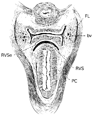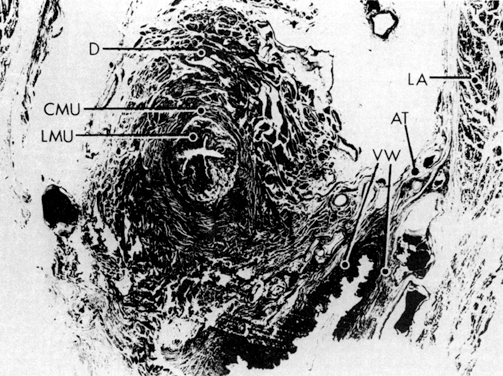 Milley and Nichols9 studied the connective tissue supports of the urethra and confirmed the observations of Zacharin10 that the urethra is suspended from the pubic bone for most of its length by arched, bilaterally symmetric, anterior, posterior, and intermediate pubourethral ligaments. Our studies further showed, as was suggested by Curtis and associates,11 that the anterior and posterior ligaments are formed by reflections of the inferior and superior fascial layers of the urogenital diaphragm (Fig. 3). The intermediate ligament represents a fusion of these fascial layers. No transverse perineal ligament was found in any of our examinations, suggesting that this term, in the female, is a misnomer. Histologic section showed the pubourethral ligaments to consist of dense collagen, both smooth and striated muscle, and elastic fibers. (The striated muscle may represent a continuation of the pubourethral muscle.) When studied by electron microscopy and neurohistochemistry, the smooth muscle bundles in this tissue are associated with numerous nerve fibers. The fine structure and enzyme content of these tissues were similar to those believed to represent cholinergic autonomic nerve tissue (acetylcholinesterase-positive). The term ligament is therefore a misnomer, because these structures contain contractile elements under neural control.12 The remainder of the urogenital diaphragm is sandwichlike, composed of superior and inferior fascial layers separated from one another by a layer of striated muscle (the deep transverse perineal muscle, the sphincter of the membranous urethra, or the sphincter vaginae). There is substantial evidence that the so-called sphincter of the membranous urethra has very minimal, if any, actual sphincter function.13 In general, sphincters of the body under voluntary control are formed by concentric layers of striated muscle, and the sphincter of the membranous urethra does not have such a morphologic arrangement of its fibers. More significantly, it has been demonstrated that sectioning the nerve supply to this group of muscle bundles has essentially no effect on the voluntary control of micturition. The diaphragm runs between the inner surfaces of the ischiopubic rami and is pierced in the midline by the urethra and vagina; by attachment to these structures, it assists in holding them in place. The posterior fibers of the urogenital diaphragm are fixed to the perineal body. When one is in the standing position, the urogenital diaphragm is almost horizontal in sagittal section; for this reason its fixation to the perineal body contributes to the support of the urethra and vesicourethral junction, lessening the tendency of these structures to rotate around the attachment of the pubourethral ligament to the pubis. The superficial transverse muscle of the perineum, and the ischiocavernous and bulbocavernous muscles are located superficial to the urogenital diaphragm deep within the soft vulvovaginal tissues; they appear to be considerably less important in urogenital support. |