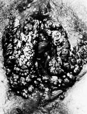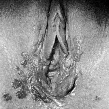 Condyloma Acuminatum Human papillomavirus (HPV) infections of the vulva are common clinical occurrences. HPV infections are classified as either clinical or subclinical, contingent on the infectivity of the virus and the response of the affected epithelium. The typical expression is a soft, pink-white, papillary epithelial lesion. These lesions may occur singly or in clusters that may become confluent (Fig. 1). The usual vulvar locations are the prepuce, vestibule, and perineal body. Perianal and anal loci also are seen frequently. Although there are more than 60 subtypes of HPV, relatively few affect the vulva.1 The HPV subtypes that are most frequently encountered on the vulva are HPV 6 and HPV 11. HPV 2, the virus associated with common epithelial warts, also is seen in the squamous epithelium of the vulva.2 HPV subtypes that are associated with a higher incidence of malignant transformation on the cervix, specifically HPV 16, 18, 31, and 35, may be present in vulvar lesions.1 The incidence of the diagnosis of vulvar, vaginal, and cervical HPV lesions has increased significantly in the last three decades.3 This increase is partly attributable to advancements in diagnostic techniques, such as polymerase chain reaction and DNA hybridization techniques. Although it is difficult to estimate the incidence or prevalence of the infection, estimated percentages of patients with clinical and subclinical HPV infection in some college populations exceed 40%.1 There is no reliable method of identifying subclinical or dormant infection. Even if only clinically expressed HPV is considered, it is now one of the most common sexually transmitted diseases. Some HPV infections may progress to vulvar intraepithelial neoplasia (VIN) and an even smaller segment may progress further to frankly invasive squamous cell carcinoma of the vulva, but the majority of lesions are limited to the HPV cutaneus expression known as the venereal wart or condyloma. Immunosuppressed states and pregnancy are associated with enlargement and progression of condylomatous lesions (Fig. 2).3