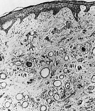 Bowen's disease or VIN III should be treated with surgical, laser, or electrical excision.4 It is preferable to remove the lesion with a technique that provides tissue for further histologic study. The use of 5-FU or systemic interferon has had marginal compliance and success.3,5 Surgical excision with assessment of margins remains the preferred management option. Close follow-up to assess recurrence is suggested. Bowenoid papillosis has a clinical and pathologic presentation that is similar to that of VIN III. It occurs in patients in the second, third, and fourth decades of life. It is expressed as multiple papillomatous lesions that may involve more than one area of the vulva.3,4 These lesions are associated with HPV infections. Biopsy findings show epithelial atypia with koilocytotic changes of HPV. Progression to an invasive malignancy occurs in rare cases, such as in immunosuppressed or immunocompromised patients. Management is conservative unless premalignant changes are present. Premalignant lesions are treated in a manner similar to VIN. Basal Cell Carcinoma Basal cell carcinomas usually are asymptomatic until they are large enough to be noticed by the patient or until ulceration and bleeding develop. The tumor is firm with rolled borders, and most often is found on the labia majora of postmenopausal women. Metastasis is rare. Management consists of wide excision of the tumor with adequate margins. Evaluation for metastases should be considered if the excised specimen shows invasion of subcutaneous fat, tumor thickness greater than 1 cm, or involvement of the urethra or vagina. Basal cell carcinomas account for 2% to 4% of benign neoplasms of the vulva.6 Histologically, these tumors have peripheral palisading of the basal cells at the epithelial margins. The remainder of the tumor has closely packed, uniform cells, with basophilic nuclei and scant cytoplasm. Mitotic figures are frequent. These tumors are locally invasive; therefore, thorough study of the entire lesion is necessary. The margins in particular should be evaluated and reported for adequacy. Margins of less than 4 mm are at higher risk for recurrence. Acrochordon Fibroepithelial polyps are common in the vulvar epithelium. They are referred to as skin tags. There is no malignant potential for this lesion. They are soft, flesh-colored, polypoid structures. Skin appendages and hair are not characteristic of acrochordon. Therapy is local excision of symptomatic lesions. Histologically, the acrochordon is described as a fibrovascular stalk with mature hyperkeratotic squamous epithelium. Epidermal appendages are infrequent, and the vascular pattern may be enhanced. Hidradenoma Hidradenomas are tumors of the apocrine sweat glands. Some may have an origin in the eccrine sweat glands. They usually are less than 1 cm in diameter, and they occur on the medial aspect of the labia majora (Fig. 6). The lesions are firm and freely movable. Ulceration and pain may develop if the lesion connects with the epithelial surface. Treatment is surgical excision. Histologically, the hidradenoma has cystic spaces that are lined with columnar cells. The lesion is further characterized by many complex folds, papillary structures, and pronounced glandular proliferation (Fig. 7). This lesion may be confused with adenocarcinoma. The distinguishing features of the hidradenoma include the lack of pleomorphism, stacking up of cells, and nuclear conformity. Syringoma Syringomas are small, benign hamartomas of the eccrine sweat glands. Usually, multiple lesions are present, and they may occur at more than one site on the body. The lesions are asymptomatic, and no treatment is needed unless pain or pruritus develops.7 Microscopically, these are tumors of dilated sweat gland ducts, and cysts lined with benign cuboidal cells (Fig. 8). A minimal inflammatory response is present unless the cysts rupture.