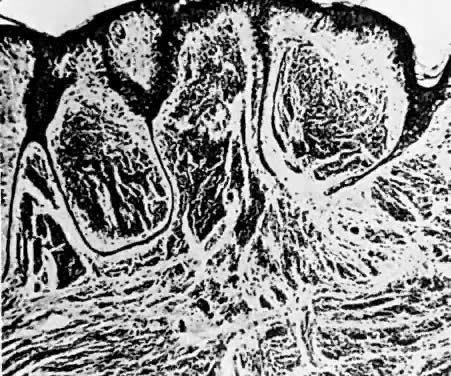 Histologically, condylomata appear as epithelial papillomas with acanthosis and parakeratosis (Fig. 3). Some epithelial cells exhibit atypical nuclei and perinuclear halos that are believed to be a manifestation of HPV infection.2 These cells are known as koilocytes. The underlying stroma usually exhibits a mild inflammatory response. Biopsies of condylomatous lesions that are resistant to treatment or that have an abnormal appearance should be performed for histologic confirmation of the diagnosis. Differentiation between condylomata and vulvar papillomatosis or other vulvar lesions can then be made.