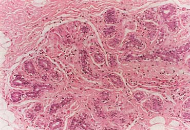 Ductal carcinoma is the most common histologic type of breast cancer, accounting for as many as 80% of breast malignancies. Nonpalpable invasive ductal carcinoma is usually perceived on mammography. The typical findings are stellate solid mass or casting-type calcifications. However, a malignant solid mass may be circular and the calcifications may be noncasting. Ultrasound can be helpful in defining a malignant solid mass, particularly in a young woman or in any woman with mammographically dense breasts, but ultrasound is not effective in evaluating calcifications that are often not perceived on ultrasound. The definitive diagnosis of nonpalpable cancer is established by image-guided tissue core-needle biopsy, commonly with vacuum-assisted technique, or by imaging needle localization and open surgical biopsy for histologic diagnosis. It is the patient herself who usually notices, often coincidentally, what she perceives as a mass. Then she presents to her physician, often an obstetrician-gynecologist, for confirmation that it is a palpable dominant mass and for diagnosis. A palpable dominant breast mass is defined as a three-dimensional distinct mass that is different from the remainder of the breast tissue and from the tissue of the other breast. The definitive diagnosis of the mass can be established by fine-needle aspiration cytology, tissue core-needle biopsy histology, or open surgical biopsy histology. Ductal carcinoma in situ (DCIS) is most commonly nonpalpable and perceived on screening mammography as malignant calcifications, usually of the casting type. The definitive diagnosis is established by open surgical biopsy with imaging needle localization. Tissue histology, usually of the entire lesion, is essential to be certain that there is not associated invasive ductal carcinoma. Invasive lobular carcinoma spreads diffusely with a typical histologic Indian file pattern. Thus, invasive lobular carcinoma is often not apparent, either by palpation or by imaging, until the cancer is at an advanced stage. Lobular carcinoma in situ is thought to be a tumor marker with associated increased risk of eventual invasive carcinoma that usually is of the ductal type when it does occur and may even occur in the contralateral breast. |
