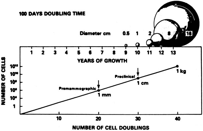 A conceptual mathematical model of the growth of a typical invasive ductal breast cancer is depicted in Figure 3.9 The growth of the cancer is based on a constant 100-day cell mass doubling time, which is the generally accepted mean rate of growth. However, estimated breast cancer doubling times have been reported in the range of 30 to 300 days and are not constant, but vary dependent on the specific cancer characteristics and host interaction. Nevertheless, the concept depicted is sound. There is a premammographic phase when the cancer is too small to be detected by any method currently available, followed by a preclinical phase when the cancer is too small to be palpable. Exactly when breast cancers metastasize is unknown, but the 90% 20-year disease-free survival of treated 1- to 9-mm mammographically detected cancers indicates that few had metastasized before the cancers reached a size of 1 cm. This concept underscores the importance of annual screening mammography particularly in the 40- to 49-year-old group in which, clinically, some of the breast cancers grow aggressively with apparently shorter doubling times. The American Cancer Society's 2003 guidelines for the early detection of breast cancer in asymptomatic women are annual mammography and clinical breast examination beginning at age 40 and clinical breast examination every 3 years for women ages 20 to 39.10 If a clinically suspicious breast lesion remains undiagnosed, the patient should be urgently referred to a breast specialist. If the patient has diagnosed breast cancer, optimum treatment is usually obtained at a dedicated breast center with a multidisciplinary treatment planning team (Table 5).