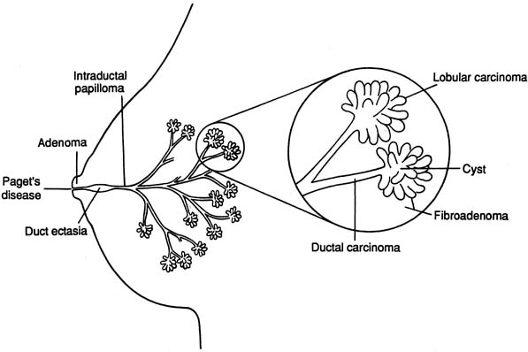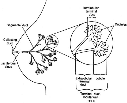 Particularly during a menstrual cycle, the ductal and alveolar epithelial cells undergo replication and programmed physiologic cell death (apoptosis), although these processes are not uniform throughout the ductal alveolar systems. Ductal mitotic activity is reported to be prominent during the late luteal phase of the menstrual cycle, when progesterone is relatively dominant.1,2 The diagrammatic representation of a single lobe and terminal duct lobular units is depicted in Figure 1. The common sites of breast pathology are depicted on a similar diagram in Figure 2. Although traditionally the breast is described as containing 12 to 15 distinct lobes, observation reveals that there are usually approximately six openings onto the nipple (galactophores), as some of the lobes join at the level of the collecting duct or even into the lactiferous sinus. Otherwise, there is no direct anatomical connection between the various lobes.