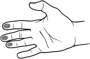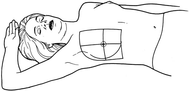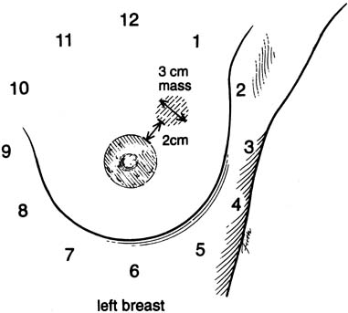 An effective technique of clinical breast examination is illustrated in Figures 4, 5, 6, 7, 8, and 9. The paramount goal of clinical breast examination is to identify a palpable dominant mass, which by definition is a three-dimensional distinct mass that is different from the remainder of the breast tissue and from the tissue of the other breast. The location of a palpable dominant mass should be identified by its clock position and its distance (in centimeters) from the areolar edge, as illustrated in Figure 10. Ideally, the size of the mass should be recorded (measured in centimeters), as well as a description of the consistency of the mass (soft, firm, hard) and the characteristics of the borders (edges) of the mass (for example, distinct, smooth, irregular, indistinct). A dominant breast mass should be definitively diagnosed in a timely manner, even though a dominant mass in a premenopausal woman is most likely benign. A dominant mass in a postmenopausal woman is most likely malignant.