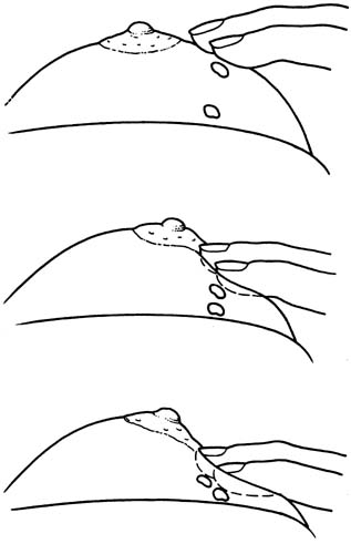 Nipple discharge, usually clear, yellow, and watery, can be elicited from the nipples of most women of reproductive age. This is physiologic. Persistent or recurrent spontaneous nipple discharge, particularly from a single galactophore (a lobe opening onto the nipple) is pathologic and should be evaluated. The most common etiology of spontaneous nipple discharge is an intraductal papilloma or papillomas. These are benign lesions. Nipple discharge is rarely a sign of malignancy unless there is an associated palpable mass and the discharge is grossly bloody. However, all intraductal lesions should be excised and histologically evaluated to not miss the rare intraductal papillary carcinoma. Figure 17 illustrates an effective method of eliciting nipple discharge. When the discharge appears, it is important to note and record the color, consistency, from how many galactophores it appears, and whether it can be elicited bilaterally. With rare exceptions, nipple discharge related to a breast cancer is spontaneous, unilateral, from a single galactophore, and bloody. Furthermore, there is usually an associated palpable mass. Galactography (ductogram) is useful in identifying the intraductal pathology and shows the surgeon the entire length of the involved duct to be excised. Otherwise, the surgeon can insert a small probe, for example, a lachrymal probe, at the time of the operation through the galactophore from which the discharge is coming. Thus, the spontaneous nipple discharge must be actively present for these procedures. The surgery usually can be performed as an outpatient procedure through a limited circumareolar incision using local anesthesia. Smears of nipple discharge, for example for cytology, are not rewarding or cost-effective. Paget's disease of the nipple (a variant of ductal carcinoma, intraductal, and/or invasive) can present as an erythematous weeping lesion on the surface of the nipple and the areola, although it usually presents as a dry, scaly, eczematous lesion. The patient may perceive this as nipple discharge. The diagnosis is made by histologic tissue biopsy. There is often an underlying palpable mass of invasive ductal carcinoma. Galactorrhea (nonpregnancy-related milky nipple discharge) can be related to medications such as oral contraceptives, chlorpromazine, and psychotropics. However, an elevated thyroid-stimulating hormone (TSH) indicates hypothyroidism and a prolactin level more than 100 ng/ml indicates a pituitary microadenoma. Mammary duct mastitis, also called ectasia, periductal mastitis, or plasma cell mastitis, usually presents as bilateral, thick, green discharge from multiple galactophores on the nipples of a perimenopausal woman. However, there is controversy as to whether these are separate diseases.29 These entities are not bacterial infections and do not respond to antibiotics. The condition is self-limited and is not associated with neoplasms, benign or malignant. Over time, the condition usually subsides, particularly after the menopause. If the patient insists on treatment, surgical excision or tying off all the ducts is the only effective treatment. |
