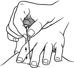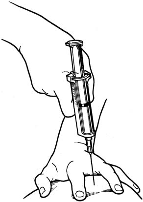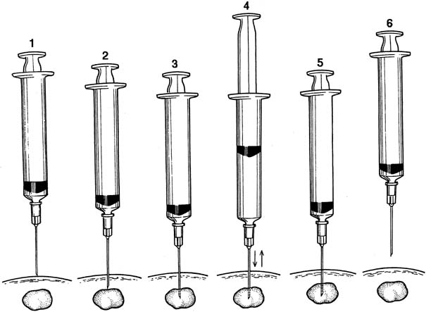 Fine-needle aspiration (FNA) of a palpable breast mass is a well-established diagnostic technique. Figure 11 illustrates FNA with a small handheld syringe holder, and Figure 12 shows the sequential steps of needle insertion and application of negative pressure within the syringe. Palpable cyst can be readily identified and therapeutically drained by FNA. With an adequate cell sample, an FNA cytologic diagnosis of a palpable solid breast mass can be obtained in as many as 90% of cases.11,12