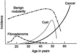 Histologic fibrocystic changes (see color plates 5–6) are probably present in the breasts of most women of reproductive age.22,23,24 Reproductive age can be defined as those years during which a woman is having regular menstruation; for example, ages 14 to 50. There is wide variation in the amount and severity of fibrocystic changes. Clinically, a confluence of fibrocystic changes can form a dominant palpable mass and require a specific histologic biopsy diagnosis.22 Such a confluence of fibrocystic changes is a common biopsy diagnosis during the reproductive years of woman's life but is rare after the menopause (Fig. 15) There is a vague correlation between the histologic presence of fibrocystic changes and the palpable diffuse nodularity that is commonly felt throughout the breasts of women of reproductive age, is often somewhat tender, and that may be associated with premenstrual mastalgia.22 Fibrocystic changes per se are not premalignant and are not associated with increased risk of breast cancer. The definitive diagnosis of fibrocystic changes is a histologic tissue diagnosis.