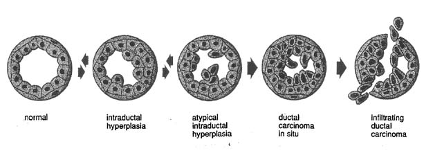 An adenolipoma usually presents as a smooth palpable mass and has a characteristic mammographic pattern. Apocrine metaplasia of the epithelial cells, which enlarge and are eosinophilic, are histologically noted in the lining of a cyst. Ductal hyperplasia is a benign histologic process, but when the hyperplasia is atypical it is associated with an increased risk of carcinoma and thought potentially to be the beginning of transformation to ductal carcinoma in situ and eventually invasive ductal carcinoma (Fig. 18). Fat necrosis can mimic cancer by examination but has a distinct mammographic appearance and is often secondary to breast trauma. Fat necrosis usually subsides spontaneously but may leave a residual mammographic lesion. A galactocele is a palpable milk-filled cyst most commonly associated with pregnancy or lactation. FNA can diagnose and drain a galactocele. A lactating (lactational) adenoma histologically resembles a tubular adenoma but the presence of milk is a prominent feature. Lactating adenomas are pregnancy- and/or lactation-related. A lipoma has a thin smooth border on mammography, can be palpable, and reveals only adipose cells by FNA or adipose tissue by biopsy. Lobular hyperplasia is a histologic diagnosis and may progress to lobular neoplasia with the potential of transformation to malignancy; for example, lobular carcinoma in situ. Mondor's disease is phlebitis and subsequent clot formation in the superficial (skin) veins of the breast. Typically, Mondor's disease presents as a firm, vertical, cord-like structure usually associated with a history of trauma to the breast; for example, surgery. The lesion usually resolves spontaneously in 8 to 12 weeks. A tubular adenoma presents similarly to a fibroadenoma both by examination and mammography. Histologically, the glandular elements predominate over the stromal elements that are contrary to fibroadenoma histology. |