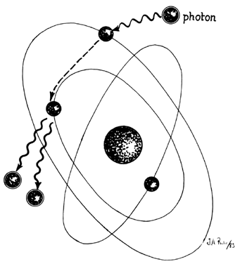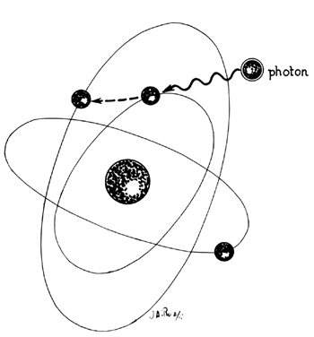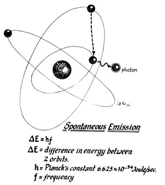 Lasers are named according to the medium that is activated. The common lasers in gynecology are CO2, argon, KTP, and Nd:YAG. Each medium produces light waves of specific wavelength giving it a characteristic color (monochromatic). A simple way to understand how light is emitted is to look at an atom with its surrounding electrons (Fig. 1). These electrons occupy discrete orbits that shift to higher orbits when they absorb energy (Fig. 2). Whenever the medium is activated, electrons are displaced to higher energy orbits. In the case of the CO2 laser, activation of the gas particles is done by using electrical wall current. The electrons that are displaced quickly return to their resting orbits, releasing a package of energy in the process referred to as a photon (Fig. 3). This process of light generation is known as spontaneous emission. An example of this process is a light bulb, which emits light waves of different frequencies in all directions out of phase.