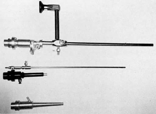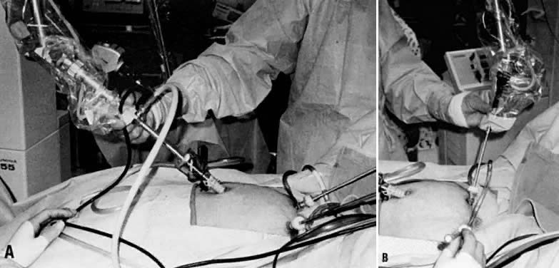 Carbon dioxide lasers were first used by Bellina and associates in 1974 for intra-abdominal applications.27 By adapting the laser to the operating microscope, reconstructive microsurgical procedures, including salpingolysis, salpingostomy, fimbrioplasty, and treatment of endometriosis, were possible. With improvement in technology and increased experience performing laparoscopic procedures, the use of the laser for laparotomy has been replaced by an endoscopic approach. Laparoscopy Instrumentation and Lasers The CO2 laser is the laser most commonly used in gynecologic surgery, for both extra- and intra-abdominal applications. It has the advantage of causing little peripheral thermal damage, usually less than 1 mm, and what is seen in penetration is the true end result. Thus, it can be used in critical areas adjacent to bowel, ureter, and bladder. CO2 lasers can be used to vaporize, excise, or coagulate tissue by modifying the power density. The CO2 laser beam can be directed by a handpiece when used in laparotomy or, alternatively, through a first or second puncture when used in laparoscopy (Fig. 26).