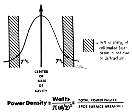 There are three basic parameters that determine the amount of energy being delivered to the tissue. The first is the wattage. For most gynecologic procedures using the CO2 laser, one rarely exceeds 20 W to 30 W, which is used primarily for excision purposes. The second parameter is time. The longer one remains focused on one spot, the more energy is applied to that area. To limit tissue damage, especially in critical areas, one can simply move the beam back and forth, or select an intermittent, timed pulse mode, usually in fractions of a second. The third parameter that can be controlled is the spot size of the beam. As one gets closer to the target area, the spot size is made smaller, producing a more intense effect. The combination of watts (power) and spot size determines the rate of tissue interaction. The higher the power density, the greater the laser's ability to vaporize and cut. This concept is expressed in watts/cm2 (unit/area) and referred to as intensity or power density. Power density is, therefore, inversely proportional to the area of the spot size and to the beam diameter. Doubling the beam diameter reduces the power density to one fourth. Conversely, by decreasing the diameter of the spot size, the power density is increased by 4 (Table 1). TABLE 1. Power Density in Watts/cm2