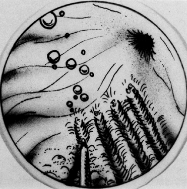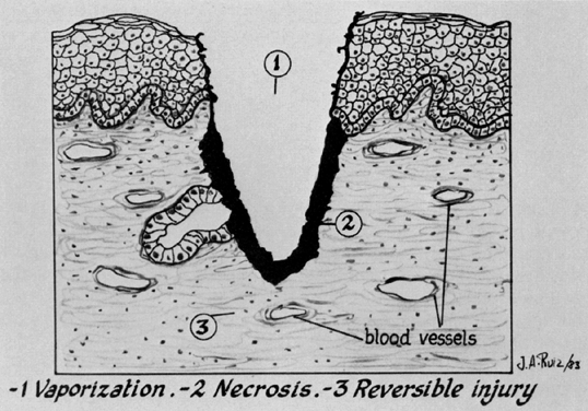 As a result of a laser beam impacting on tissue, a spot or crater is created. The diameter of this crater is a property of the divergence of the beam and the focal length of the lens through which the laser is focused. If the power of the laser is kept constant, the depth of the crater will vary inversely to the diameter of the spot. In other words, the smaller the spot, the deeper the crater. To obtain reproducible data, terminology relating to the level of tissue absorption must be reported. Intensity or power density refers to the transfer of laser energy to a given mass of tissue and is expressed in terms of watts per centimeter squared (Fig. 9). Because 86% of the laser power is absorbed by the spot, this figure should be multiplied by 0.86 to determine the power density. Three types of tissue injury may be identified following a laser wound. The zone of vaporization is characterized by an absence of tissue and a V-shaped defect, because energy is greater in the center of the beam than on the perimeter. Immediately below the zone of vaporization is a fixed zone of stromal necrosis measuring (in cervical tissue) approximately 50 μm to 100 μm in depth, regardless of the crater's extent. Within this zone, small vessels (<1 mm) are sealed. The third zone is one of reversible injury or potential repair. Laser wounds are clean, produce minimal tissue damage, and cannot be compared with cautery wounds, in which substantial devitalized debris remains behind. Therefore, laser and scalpel wounds are similar (Fig. 10). The CO2 laser may serve three principal functions: as a cutting or excisional instrument, as a vaporizing or ablating instrument, and as a defocused cauterizing instrument.