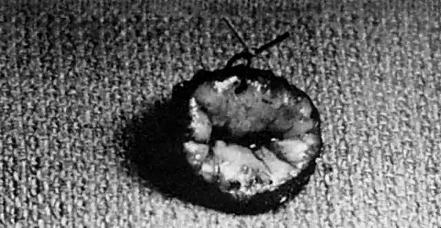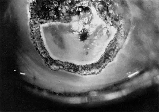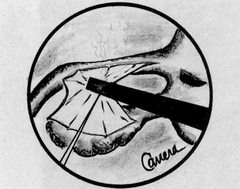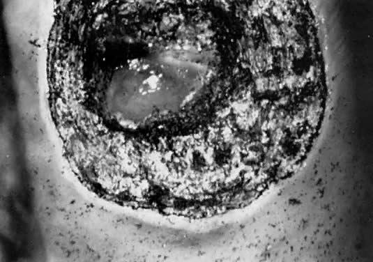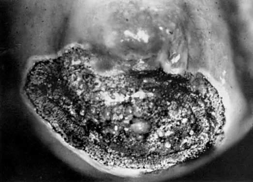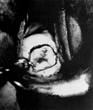 A colposcopic examination is first performed and the peripheral limits of the cone are mapped out with a series of shallow craters. Traction sutures are placed in the cervix at the 3 o'clock and 9 o'clock positions. A 1:30 diluted solution of vasopressin is next injected submucosally into the cervix by means of a 1-mL tuberculin syringe and a small-gauge needle. The injections are performed to cause deeper vascular channels to go into spasm; the constricted vessels are sealed by the traversing laser beam. Next, the tracing dots are connected by a shallow scoring incision. The power meter is advanced to 20 W, the spot size is reduced to approximately 0.5 mm in diameter, and a deep incision is cut into the cervical tissue (Fig. 14). A long-handled skin hook applies sharp traction and opposing countertraction to allow the laser beam to cut rapidly to a depth of 10 mm to 15 mm; this deep incision is extended around the cervix as the hooks are simultaneously moved in concert with the cutting beam (Fig. 15). Rather than a cone, a cylindrical-shaped mass of tissue will be incised (Fig. 16). Again, using the hooks, the specimen is sharply angulated and the endocervical margin is cut with a sharp scalpel blade. Minimal bleeding is encountered. When the cylinder of cervical tissue has been removed, small bleeding points are coagulated by reducing or enlarging the spot. The remaining endocervical canal is sounded and curetted. At the termination of the procedure, the defect is tightly packed with petrolatum gauze (Fig. 17). This procedure can be performed under local or general anesthesia. Patients should not insert anything vaginally for at least 2 to 3 weeks and should be warned that light spotting is common, occurring in 10% of patients. Postoperative discomfort is usually minimal, and discharge is common. Follow-up examinations are performed at 8 weeks, 3 months, and 6 months thereafter.