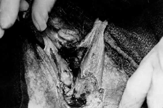 COMBINED EXCISIONAL AND VAPORIZATION CONIZATION. When CIN extends far out on the portio of the cervix, as well as into the endocervical canal, a combination laser procedure may be indicated. Multiple sampling biopsies are obtained from the ectocervical sites to ensure that intraepithelial disease is present. A small excisional cylinder of cervical tissue is removed to a depth of 1.5 cm to 2 cm and sent to a pathology laboratory for evaluation. The ectocervical extension is vaporized to a depth of 5 mm to 7 mm. Patients have reported three types of discomfort associated with laser vaporization of the cervix. The initial impact of the laser beam on the cervix is usually perceived as a pinch similar to that experienced with applying a tenaculum or taking a cervical punch biopsy. As vaporization progresses, many women complain of uncomfortable warmth as heat is transferred to peripheral cervical stromal tissue. The latter may be dissipated by stopping treatment for a moment. Invariably, heat buildup will lead to substantial discomfort if not relieved. Finally, as a large bulk of cervical tissue is removed, menstrual-like cramping is reported by virtually every woman. The cramping can be related to the liberation of prostaglandinlike substances. The cramping can be ameliorated by the administration of a prostaglandin synthetase inhibitor (e.g., Motrin) approximately 30 minutes prior to laser vaporization. ANESTHESIA. In 95% of vaporizations, no anesthesia is used. In the remaining 5%, local infiltration, paracervical block, or general anesthesia may be used. All laser excisional conizations are performed with either general or paracervical block anesthesia. RESULTS OF TREATMENT. The results of CO2 laser treatment of intraepithelial neoplasia are very acceptable and comparable to loop excision. Baggish, Dorsey, and Adelson reported a series of 954 laser excisional cones with 97% showing no evidence of persistent recurrent disease.11 Four cases of invasive cancer were identified, and 73 women had disease extending to the margin; 44 of the latter were followed with no further treatment and remained free of disease. There were 25 women in this series with persistent disease requiring repeat cone or hysterectomy. COMPLICATIONS OF LASER CONE BIOPSY. Complication rates with laser cones are very low; cervical stenosis occurs in 1.3% of cases, cervical incompetence in 0.05%, and major bleeding in less than 1% of patients.12,13 Vulva—Vulvar Intraepithelial Neoplasia (VIN) The skin surface of the vulva may be afflicted with a variety of superficial diseases amenable to laser surgery, including vulvar intraepithelial neoplasia (VIN) and condylomata acuminata. Vulvar intraepithelial neoplasia (VIN) is an intraepithelial neoplasia disorder that peaks in occurrence in women 35 to 54 years of age. Its coexistence with human papillomavirus infection 16 and 18 has been documented.14,15 In women younger than 40 years of age, VIN appears to be less aggressive in growth than in those older than 50 years of age. There seems to be a more linear relationship between VIN and invasive disease in the over-50 group than in the younger group.16 Treatment of VIN in the past has included simple vulvectomy and skinning vulvectomy. These more aggressive and disfiguring procedures were replaced by wide local excision and laser ablative procedures of the affected vulvar area. Although the CO2 laser has been used widely for ablation of VIN, it does not allow tissue specimen for determination of possible existing invasive disease and identification of margins. Instead of performing laser ablation in treating VIN, the surgeon can obtain laser thin sections (Fig. 19). This method allows the intradermal removal of strips of vulvar skin affected by VIN and at the same time provides a tissue sample for the pathologist to inspect depth of penetration as well as the adequacy of surgical margins.17 Laser—thin-section treatment to the vulva requires anesthesia. General anesthesia is preferred for extensive disease, but local anesthesia can be used if the extent of tissue removal is limited to a small area. Thin section is performed by first using a 27-gauge needle for intradermal injection of either saline or local anesthetic plus 1:1000 diluted vasopressin in the involved area. This intradermal injection forms a barrier that absorbs heat and minimizes thermal energy. The spot size used is generally 0.5 mm with a superpulse power of 20 W to 25 W. Once anesthesia has been applied, tracer spots are used to demarcate the boundaries of skin to be removed. Generally, the timing interval is set for pulses of 0.2 seconds and 10 W of power. Once these spots have been made, they are then connected with the higher power previously mentioned. A laser hook is placed at the margin of the incision, and a tissue plane is then developed. With traction placed upward, the thin section is completed by removing strips of epithelium to depths ranging from 1 to 2 mm. The laser-treated area heals in a manner similar to that in laser ablation, avoiding the use of suture or grafts. Using a beam with a larger diameter of 1 mm to 1.5 mm, superficial vaporization of tissue is carried out to a 3-mm peripheral margin from the incision edge. The char material can be swabbed off with 4% acetic acid. Laser ablation may be preferred to the thin-section method for small areas of VIN located in specific areas, such as the clitoral area, anus, or labia minora. Postoperatively, the surgical sites are covered with bio-occlusive dressings to diminish pain. Covered wounds also appear to heal more rapidly than undressed wounds because they retain moisture. For more extensive laser wounds, patients are asked to take sitz baths using Instant Ocean four times a day (Fig. 20). These are more comfortable than saline baths and tend to debride the wounds, thereby enhancing healing. A 1:4 diluted solution of Betadine provided in plastic bottles is squirted on the perineum after urin