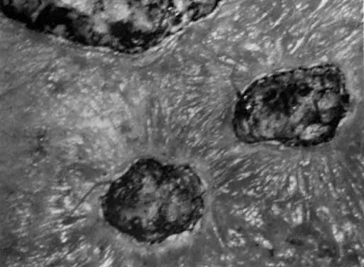 The main disadvantages of the CO2 laser include the absence of a histologic sample when vaporization is performed and the expense of the laser machine. VAPORIZATION. Using the laser coupled to the colposcope, one should first define the extent of the lesion. One should keep in mind that endocervical glands may lie deep in the stroma to a depth of 6 mm to 7 mm10; therefore, treatment should be carried out to a minimum of 9 mm to 10 mm with a peripheral margin of 3 mm. This procedure is performed with 30 W to 40 W of power with a 2-mm-diameter spot and takes about 5 to 10 minutes to complete under local anesthesia. Vaporization is performed to a minimal depth of 1 cm and ends at the level of the endocervical canal. The cervical defect should resemble a funnel, as if one performed a small cone biopsy. The operative site is circumferentially outlined with a 3- to 5-mm margin around the lesion (Fig. 11). The cervix is then divided into four quadrants. Power is increased to 30 W to 40 W. Beginning in the lower quadrants and using a circular pattern, vaporization is carried down to a depth of 1 cm. The endocervical canal is usually spared. Measurements are made at frequent intervals, relating the depth to the surrounding ectocervical surface. When the lower half of the cervix has been vaporized, a similar procedure is followed for the anterior surface (Fig. 11, Fig. 12, and Fig. 13).