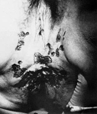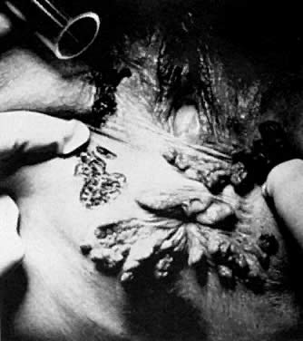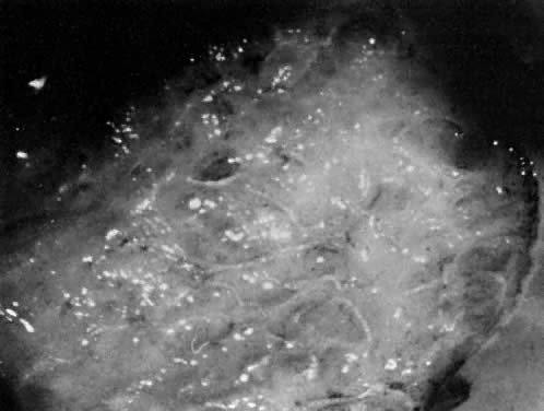 Most patients experience little immediate pain. The explanation for this relative anesthesia relates to the nerve-sealing action of the laser, which results in a clublike nerve ending, compared with the shaving brush pattern seen after a knife cut. Delayed bleeding is rare after laser vaporization or thin section. Because full-thickness excision usually results in scarring, great care must be taken during any excision or vaporization treatment to avoid extending beyond reticular dermis. Deeper vaporization can be identified by the visualization of fine, white, subvulvar fat. Another concern is coaptation of the labia. This may be avoided by having patients manually separate their labia during sitz baths. With laser ablation for treatment of VIN, cure rates of approximately 80% can be expected.18,19,20 With thin section, these cure rates may exceed 90%. Careful long-term follow-up is imperative. Because vulvar carcinoma in situ is a disease predominantly of younger women, conservative methods of treatment that preserve functional anatomy should be offered to every patient. Even with extensive lesions, laser therapy compares favorably with other methods of treatment. Paget's disease may be the exception; recurrent disease is quite common after laser therapy. CONDYLOMATA ACUMINATA. The most common indication for CO2 laser surgery in the lower genital tract is the treatment of condylomata acuminata.21 These lesions caused by the human papilloma virus (HPV) are most commonly found on the vulva and perianal skin. Although genital warts can cause irritation and some discomfort, they are not generally painful; most patients seek medical attention because of their unsightly growth. They spread principally by autoinoculation of the HPV virus and may undergo spontaneous regression. Pregnancy, oral contraceptive use, diabetes, immunosuppressive drug therapy, and immunodeficiency virus infections can accelerate growth of genital warts. These lesions may be polypoid, flat, papillomatous, fleshy, white, or pigmented in appearance. The indication for CO2 laser ablation of genital warts is the presence of gross disease, and not subclinical HPV infection, such as koilocytosis and papillosis. Local anesthesia may be used for small isolated vulvar warts. However, with more extensive disease, general anesthesia is preferred. Warts should be vaporized no deeper than the level of the surrounding skin surface (Fig. 21, Fig. 22, and Fig. 23) using a power level of 40 W to 60 W with a beam diameter of 3 mm. After complete vaporization of the genital warts is accomplished, the 1 cm to 2 cm of skin surrounding the individual lesions is brushed lightly with 10 W of power and a 2-mm-diameter spot size to destroy subclinical HPV involvement and diminish the recurrence of the disease. When the condyloma lesion has a well-defined pedicle, it is more efficient to excise rather than vaporize the entire lesion. Ablation of the remaining base is then accomplished to the level of the skin surface. The postoperative treatment regimen is identical to that described for VIN. Laser treatment of genital warts is effective; they are eliminated in over 90% of patients. For those patients who are immunologically compromised, chronic application of 5-fluorouracil cream has been recommended.22 The use of recombinant interferon after laser treatment by Reid and colleagues has also diminished their recurrence.23