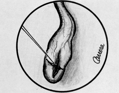 Anal, genital, and urethral warts are vaporized more superficially with power settings of 10 W to 15 W and a beam diameter of 1.5 mm. VAGINA. Vaginal intraepithelial neoplasia (VAIN) is the least common of the group of lower genital tract premalignancies with an annual incidence of 0.2 per 100,000 women.24 It is found most often in women who have had CIN or VIN. Its location is most often in the upper third of the vagina, and lesions are usually multifocal. The lesion can be identified by colposcopy after swabbing suspected areas of the vagina with 4% acetic acid. Lesions in the vagina may be white or flat or have a raised condylomatous pattern. Although many treatment options for VAIN are available, including cryosurgery, electrocautery, radiation therapy, and surgical excision, the use of laser therapy is an excellent option. Townsend and colleagues, in 1982, reported a success rate of 90% in a series of 52 patients treated in this manner.25 Power density of approximately 500 W/cm2 with a beam diameter of 2 mm is recommended for laser vaporization of the vagina. Laser treatments should be performed with the aid of a laser hook to help increase vaginal exposure (Fig. 24). Vaporization should be carried to a depth of 1 mm or less (Fig. 25). Wide peripheral margins should be obtained to eliminate this multifocal disease. Disease in the upper third of the vagina should be treated by vaporizing the entire upper third of the vaginal canal. If there is spread of disease from the upper third to the middle third, then the upper two thirds of the vagina should be vaporized. If VAIN involves areas in all thirds of the vagina, then the entire vagina should be vaporized. This is best done in two planned sessions. The use of superpulse laser at settings varying from 100 to 300 pulses per second with a pulse interval of 0.1 to 0.3 milliseconds is recommended. This rapid pulse with rest intervals helps preserve underlying stromal tissue and shortens healing time. There is no scar formation and no reduction in vaginal capacity. This surgery is best done with a CO2 laser coupled to a colposcope under general regional anesthesia. Following laser vaporization, postoperative discomfort is minimal, and healing of the mucous membrane is restored within 4 weeks. Because postoperative bleeding is not usually a problem after laser vaporization, there is no need for routine use of solutions such as ferric subsulfate. A more recent study by Dorsey and Baggish involving 83 cases of VAIN treated by laser only resulted in an 80% cure rate with 40% of the cases requiring more than one laser treatment.26