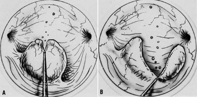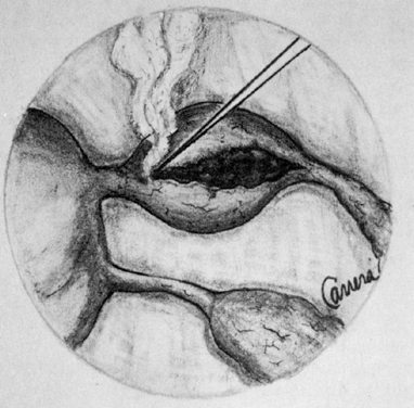 An important step in this technique, which reduces the possibility of cervical stenosis, is the creation of the endocervical button (Fig. 18). This is accomplished by vaporizing the stroma around the endocervical stump to a depth of 2 mm to 3 mm.