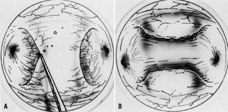 The CO2 laser can be easily coupled to an operating laparoscope. The laser beam should be aligned so that it lies in the middle of the viewing lens, and it should be finely focused. A second or third puncture is necessary only to manipulate pelvic structures, to clear the field of plume production, or for irrigation purposes. It is also possible to use the CO2 laser for second punctures by using wave guides that attach directly to the CO2 laser and allow some flexibility in delivering the laser energy. Research in developing a truly flexible fiber to deliver CO2 laser energy is still needed. At present, fiber systems used in intra-abdominal laparoscopic surgery include primarily KTP, Nd:YAG, and argon lasers. An advantage of the lasers using flexible delivery systems is that they allow tactile contact with the tissue. Because each of these lasers has a different wavelength and different absorption properties, it is important to recognize their tissue interaction effects before they are selected for surgery. The KTP and argon lasers share very similar wavelengths (532 μm versus 0.458 μm–0.515 μm) and thus produce similar tissue effects. The energy produced is selectively absorbed by tissue containing hemoglobin or is heavily pigmented. By moving the fibers closer or farther away from the tissue, one can achieve cutting, vaporization, or coagulation effects on tissue. The main drawback of these lasers is the required use of goggles for eye protection, which distorts color discrimination. Although the Nd:YAG laser was originally used in gynecology primarily for hysteroscopic application, it is now possible to use it solely intra-abdominally by the use of contact sapphire probes or specially made sculptured tips. These probes provide a tactile feel of the tissue, and by selecting a variety of probes, one can incise, excise, vaporize, or coagulate tissue. All of these lasers have been shown to be effective in the treatment of various gynecologic conditions, including: Endometriosis Endometriosis Areas of endometriosis can be vaporized or excised with the CO2 laser depending on the depth of penetration of the lesion. Superficial areas of endometriosis in the cul-de-sac, uterosacral areas, or peritoneum in general can be vaporized with wattages of 10 W to 20 W with spot sizes of 1 mm. With lesions larger than 5 mm, it is recommended that the surgeon cut through a healthy margin of the peritoneum and totally excise the lesion. This scalpel effect can also be accomplished with flexible laser fibers, as well as with electrosurgery and scissors. In addition, the wavelengths of the argon and KTP lasers have an affinity for pigmented lesions such as endometriosis, and these lasers have been used extensively and effectively by Keye and Dixon to heat and vaporize these lesions.28 The CO2 laser, however, remains the most commonly used laser and is the method of choice for treating American Fertility Society (AFS) stage I to IV endometriosis. The main reason is its high margin of safety, which is due to its limited peripheral tissue injury and penetration. This makes it ideal for adhesion excision near ureters and bowel. Although the CO2 laser is ideal for surgical treatment of endometriosis, it does not offer an increased pregnancy rate over other options, including sharp dissection with scissors or electrosurgery.29 Reported pregnancy rates after laser treatment of endometriosis are 57%, 53%, and 61% for mild, moderate, and severe disease, respectively.30 Endometriomas can also be effectively treated with the CO2 laser. Initially, a small opening on the cyst wall is made to allow for aspiration of the chocolate contents and profuse irrigation with a 5-mm aspirator probe. The edge of the endometrioma and normal ovarian cortex are then grasped individually with atraumatic forceps. With the CO2 laser used intermittently at 10 W to 20 W, and with traction and countertraction of the forceps holding the ovarian cortex and endometrium cyst wall, the cyst can be stripped off. Removal of the cyst wall may be in several portions. The base of the ovary after removal of the cyst wall can then be ablated by defocusing the beam and decreasing to 10 W of energy. This causes coagulation of small areas of oozing and destroys any small areas of cyst wall that may remain. Patients with endometriosis who suffer from significant dysmenorrhea are also candidates for laparoscopic uterosacral nerve ablation. This controversial procedure was originally described by Doyle in 1963 and refers to the denervation of sensory fibers in the lower uterine segment.31 The CO2 laser is used to vaporize a lesion 1 cm in diameter by 1 cm in depth at the junction of the uterosacral ligaments to the posterior cervix. A comparison between the CO2 laser and electrosurgery for treatment of dysmenorrhea revealed a 50% relief of pain from both procedures.32 Adhesiolysis Pelvic adhesions are common sequelae to previous pelvic infections and pelvic surgery. Although adhesiolysis is commonly performed with scissors or electrosurgery, the laser is another option and represents an ideal instrument for lysis of vascular adhesions, because excision and coagulation can be performed simultaneously while limiting peripheral tissue trauma. The use of graspers to apply tension on the adhesions maximizes the efficiency of the laser (Fig. 27). The use of quartz rods, rods with backstops, and irrigation is recommended to avoid injury to adjacent normal tissue. The pregnancy rate outcome with the laser, however, does not significantly differ from that with other standard modalities used to treat adhesions.33 Salpingostomy Correction of distal tubal obstruction by cuff salpingostomy was first reported in 1884 by Schroeder.34 Because of the dismal pregnancy rate, this procedure did not become popular until principles of microsurgery were emphasized. Despite improvements in surgical technique, pregnancy results remained low and dependent on the extent of tubal 