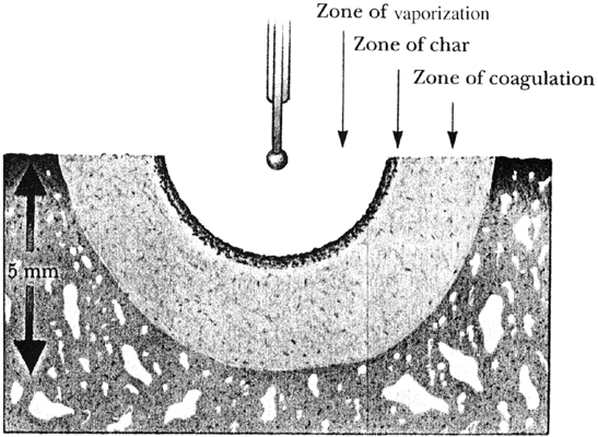 Hysteroscopic Method Although the mechanics of the hysteroscopic methods of endometrial ablation are discussed in this chapter, the mechanics of operative hysteroscopy are not. The reader is referred to other chapters for discussion of general hysteroscopic principles, distention media, and technique. LASER ENDOMETRIAL ABLATION. The Nd: YAG laser emits an invisible beam of light with a wavelength of 1064 nm. The Nd:YAG laser has three properties that make it well suited to endometrial ablation: (1) it penetrates the endometrium to a depth of 5 to 6 mm, (2) it passes unabsorbed through clear liquids, and (3) it can be directed through flexible quartz fibers. Quartz fibers of different diameters from 600 to 1200 μm have been developed for use with the Nd:YAG laser The tissue effect with these fibers is related to the power density produced. Wider fibers have lower power densities and require a longer contact time to produce the same effect achieved with a smaller fiber at any given power. Generally, 6000-μm fibers are recommended for endometrial ablation. The flexible quartz fibers used for endometrial ablation are surrounded by a protective plastic coat. When laser energy is directed through these “bare fibers,” it penetrates the surface of the endometrium and exerts a maximal thermocoagulation in the superficial myometrium. Thus, a deep thermocoagulation is achieved (Fig. 2). This is ideal for endometrial ablation but not well suited for other applications such as intra-abdominal applications. Consequently, shaped “sapphire” ceramic tips that can focus the laser energy in various configurations, depending on the shape of the tip, have been developed to fit onto these bare quartz fibers. Although these tips reduce the depth of tissue destruction and increase the range of applications in which the Nd:YAG laser can be used, they should not be used for endometrial ablation. In endometrial ablation, deep tissue destruction is desirable to destroy the basalis layer. Any reduction in the depth of destruction potentially reduces the effectiveness of the procedure.