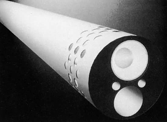 Initial studies in women undergoing hysterectomy have indicated that the temperature of the uterine serosa remains unchanged during balloon ablation.13 These same studies also indicate that cell death could be expected up to 5 mm from the surface of the balloon. RADIO-WAVE ELECTRODE INTRAUTERINE BALLOON. The radio-wave balloon consists of an inflatable balloon with electrodes attached to its surface (Fig. 7). One such device, the Vesta radio-wave balloon (Valleylab, Inc, Boulder, CO), has been undergoing FDA testing in the United States. The Vesta balloon contains 12 electrodes, each of which is controlled by a separate thermistor. The system works on the same principle as other electrosurgical devices. The system delivers radiofrequency current to the endometrial tissue. This is converted into intracellular heat, producing coagulation. After the device is inserted into the endometrial cavity, the balloon is inflated and activated. Unless all electrodes make contact with the uterine wall, the device will shut down. Once activated, the electrodes are kept at 75°C for 4 minutes. The surface thermistors control the tissue effect to obtain a predetermined depth of coagulation. Currently, further development of the Vesta system in the United States has been put on hold by the manufacturer while they consider design changes requested by the FDA. Another device using radiofrequency current is Novasure (Novocept, Palo Alto, CA). This device, which has not undergone US trials, uses an intrauterine fan made of two layers of copper mesh. After placement in the uterine cavity, the fan is deployed. This action creates a suction to bring the endometrial walls and the mesh into close contact. Bipolar radiofrequency current is then used to ablate the endometrium in less than 2 minutes. The radiofrequency generator monitors the tissue impedance and automatically terminates the procedure at the desired depth of coagulation. BALLOONLESS HOT WATER SYSTEMS. Several companies have developed endometrial ablation systems that use unconfined intracavitary hot water as the source of heat for endometrial ablation. In the United States, only one manufacturer (BEI Corporation) has began patient trials. This HydoTermAblator, or HTA, system uses externally heated saline rather than an internal source of energy (Fig. 8). Unlike the previously discussed systems, the uterine cavity is irrigated with the heated solution rather than being contained within a balloon. This irrigation is performed under constant hysteroscopic monitoring. Preliminary studies indicate that uniform endometrial destruction to a depth of 3 to 4 mm in the uterine cavity and 2 to 3 mm in the cornual region is easily obtained.14