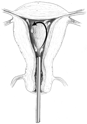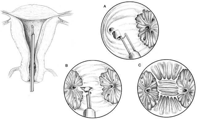 Sapphire tips by the nature of their design are subjected to very high temperatures and must be cooled by a secondary cooling system to prevent overheating. One method of cooling involves directing carbon dioxide (CO2) gas under pressure through a coaxial channel. This gas exits a small opening near the base of the sapphire tip and cools the tip. The combined effect of a large volume of gas under pressure instilled into the closed uterine cavity may produce a gas embolus. Several deaths from this effect have been reported.12 Therefore, the use of gas-cooled tips in the uterine cavity is absolutely contraindicated. The use of a bare quartz fiber can be used in two different manners to perform endometrial ablation. These two methods are the contact, or dragging, method and the noncontact, or blanching, method. The contact method was the original method used by Goldrath and associates to perform the first laser endometrial ablation.2 This method involves “dragging” the bare fiber across the endometrial surface. In this technique, the fiber is kept in constant contact with the endometrial surface. The principal advantages of the dragging technique is that it is very easy to identify the treated areas from the untreated areas and the technique can be easily used for all areas of the uterine cavity. In the noncontact, or blanching, technique, the quartz fiber is held at right angles to and a short distance above the endometrial surface. This method is believed by its supporters to be less likely to interrupt underlying blood vessels, thus reducing the risk of fluid intravasation. The primary disadvantage to this method is the difficulty in getting the fiber at the correct angle over the endometrial surface. There is also occasional difficulty in differentiating photocoagulated tissue from the pale suppressed endometrium. Because the light produced by the Nd:YAG laser is invisible to the human eye, a helium neon (HeNe) laser is used to illuminate the distal 5 mm of the tip. Thus, the tip glows red not because it is hot but because of the light produced by the HeNe laser. Technique of Laser Endometrial Ablation. The contact, or dragging, technique is more commonly used than the noncontact method, and a description of it follows. However, the basic principles of the technique still apply to the noncontact method. After placement of the hysteroscope, the laser is activated at a power of 50 to 80 W. A power of 50 W is probably the lowest power setting that will provide adequate endometrial ablation. Higher powers are inherently more dangerous but also permit shorter treatment times and reduce the potential for fluid absorption. Powers up to 80 W are recommended by some authors. Although several different variations in technique are available, most laser procedures start at the tubal ostium area. A series of circular parallel furrows are performed until the ostium is completely ablated. The procedure is repeated on the opposite side (Fig. 3). Then the anterior wall, the lateral walls, and finally the posterior wall are ablated.