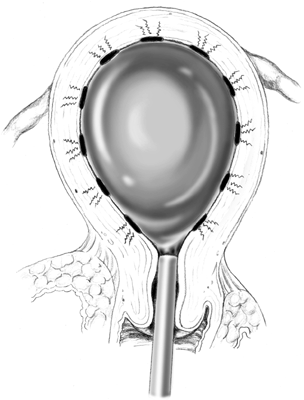 The laser is only activated as the fiber is being pulled toward the surgeon and never as the fiber is being pushed back toward the fundus. This is a safety measure because the fiber is more likely to perforate the uterus while being advanced. If a perforation should occur while the laser is activated, serious damage can occur. The laser also should not be activated unless the glowing red tip can be seen, ensuring that the tip is within the endometrial cavity and not outside the uterus. The laser should also be fired only when the fiber is moving. Otherwise, the depth of destruction will be much greater than desired. ELECTROSURGICAL ENDOMETRIAL ABLATION. The development of electrosurgical methods of endometrial ablation has resulted in decline in the use of the laser ablation techniques. Many physicians find the electrosurgical methods to be easier and to require less operator skill, and the equipment cheaper to acquire and maintain. With laser ablation methods, the procedure is generally more prolonged, lasting 30 to 40 minutes compared with 20 to 30 minutes with electrosurgery when performed by an experienced operator. The overall reported cure rate with electrosurgical methods is slightly less than that reported with laser but the difference does not appear to be clinically significant. Unlike laser energy, electricity is conducted by electrolyte-containing fluids. Thus, nonelectrolyte fluids must be used when working with unipolar electrosurgical systems. Use of these fluids increases the likelihood of fluid overload and hyponatremia. With the use of endometrial resection, the risk of uterine perforation is increased over that of rollerball techniques. Furthermore, resection of the superficial portion of myometrium increases the likelihood of bleeding and exposes the venus sinuses. These open sinuses increase the absorption of the irrigation fluid and increase the possibility of hyponatremia. With rollerball coagulation, vessels are coagulated rather than opened, thus decreasing fluid absorption and bleeding compared with resection methods. Although endometrial resection can resect small submucous fibroids, there is an increased risk of uterine perforation with resection methods. One theoretical benefit with endometrial resection is that pieces of the endometrium are available for examination by the pathologist. With coagulation methods, no material is available for review. However, with appropriate evaluation of patients before ablation procedures, along with the possibility of target biopsy at the time of the procedure, the likelihood of missed carcinoma is quite rare. Procedure for Rollerball Ablation. Generally, the electrosurgical generator is set at 60 to 100 W. Although we generally use pure cutting current, many authors use some form of blended current during ablation. Whatever the current modulation, the lower wattage should be chosen initially and then increased depending on the tissue effect observed. With the commonly used 3-mm ball and a drag speed of 1 cm/second, the crater produced is approximately 1 mm in depth with thermal damage extending for 1 to 2 more mm. Slower drag speeds or higher wattage are associated with greater tissue penetration. The use of a rollerbar instead of the 3-mm ball allows a greater surface to be covered in a smaller amount of time but results in a lower current density and significantly less tissue penetration than with the rollerball, if all other factors are kept equal. As with other techniques, as a safety measure, the electrode should be activated only when it is being withdrawn toward the operator. Most surgeons prefer to begin coagulation with the anterior wall because accumulation of bubbles and debris in this area over time makes coagulation later more difficult. However, some surgeons coagulate the tubal ostia initially, with the belief that this decreases fluid loss through the fallopian tubes and, subsequently, the lateral walls and finally the posterior walls (Fig. 4). As the ablation is carried downward, care should be exercised not to treat the cervical canal itself because this could result in sealing off of the endometrial cavity with subsequent development of a hematometrium or pyometrium. Endometrial Resection. The technique for endometrial ablation is essentially the same as that for rollerball coagulation as noted previously (Fig. 5). Because the risk of perforation is higher with this technique, special care should be taken in the thinner area around the tubal ostia. Most surgeons prefer an 8-mm diameter loop for endometrial ablation by resection. With this loop, 4 mm of tissue are resected with each pass. However, some surgeons prefer a 4-mm diameter loop because it is easier to place in restricted areas such as the ostia and because the risk of perforation is less. For this reason, this diameter loop is frequently chosen by those just learning the technique and for teaching purposes. Disadvantages to this size loop include that the loop is more easily damaged and requires more passes to obtain adequate tissue destruction. Nonhysteroscopic Ablation Systems THERMAL BALLOON. The first balloon system granted Food and Drug Administration (FDA) approval in the United States in December 1997 was the ThermaChoice intrauterine hot water balloon (Gynecare, Inc, a division of Ethicon, Inc, Somerville, NJ). This device uses an intrauterine balloon to deliver destructive heat to the endometrial layer to destroy the blood supply (Fig. 6). The ThermaChoice procedure uses a water-filled balloon that conforms to the shape of the uterus. Once activated, the water is heated by a heating element to a temperature of approximately 87°C, or 187°F. The system is composed of a balloon connected to a catheter that is connected into a central control unit. The balloon is manually inflated with 5% dextrose in water (D5W) to a pressure of 160 to 170 mmHg. Inability to obtain suitable initial pressure may indicate a uterine perforation or a uterine