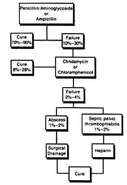 bacteria, particularly Escherichia coli. A similar biphasic disease process occurs in many clinical entities that are encountered in obstetrics and gynecology. Pelvic inflammatory disease, pelvic cellulitis, and endomyometritis are analogous to the initial phase of peritonitis in this model,4 but if untreated or inadequately treated, these infections will progress to an abscess phase characterized by pelvic abscess formation.2 The traditional approach to the treatment of mixed anaerobic-aerobic soft-tissue pelvic infections sheds additional light on the pathophysiology of abscess formation and on the importance of using antimicrobials with activity against penicillin-resistant anaerobes as part of initial therapy (Fig. 1).5 Initial treatment with penicillin and gentamicin or with ampicillin alone has a relatively high failure rate. Most initially resistant infections respond to the addition of an antibiotic with extended anaerobic activity (e.g., clindamycin, metronidazole). Patients who do not improve with broad-spectrum antimicrobial therapy should be evaluated for the presence of an abscess, septic pelvic thrombophlebitis, or drug fever. Broad-spectrum antibiotics are given as the initial treatment for patients with a diagnosis of pelvic abscess. The gold standard of antimicrobial regimens for the treatment of pelvic abscess is combination therapy with either clindamycin or metronidazole in conjunction with an aminoglycoside, third-generation cephalosporin, or aztreonam. Other agents with therapeutic utility include single-agent treatment with an extended-spectrum cephalosporin (e.g., cefoxitin, cefotetan, cefotaxime, ceftizoxime), an extended-spectrum penicillin (e.g., mezlocillin, piperacillin), carbapenems (imipenem), and β-lactamase inhibitors plus a β-lactam (e.g., ampicillin/sulbactam, ticarcillin/clavulanate, piperacillin/tazobactam; see ahead to Table 3). When antimicrobial treatment is started, a decision on the need for surgical intervention is required. Pelvic abscesses will occasionally respond to antimicrobial treatment alone. This is particularly true in patients with pelvic inflammatory disease that is complicated by a tubo-ovarian abscess. Treatment with broad-spectrum antimicrobials results in a satisfactory response to therapy without the need for surgery in 75% of cases.6 Patients with pelvic abscesses that complicate postoperative infections, such as postcesarean endomyometritis or posthysterectomy cuff cellulitis, usually require surgical intervention. Most abscesses complicating posthysterectomy infections are cuff abscesses and can be easily drained by dilating the vaginal cuff. Patients with postoperative adnexal abscesses (tubo-ovarian abscesses) are less likely to respond to antibiotic treatment alone, but trial use of antibiotic therapy is warranted before surgical drainage. Because of the high rate of persistence of infection after vaginal drainage,7 an adnexal abscess that fails to respond to antibiotics should be treated by abdominal exploration. Surgical options for the drainage of pelvic abscesses have increased in the past several years. Most surgeons prefer laparotomy and drainage, with or without extirpation of the infected tissues, as the treatment of choice. An endoscopic approach has been used increasingly to drain or excise infected tissue. A percutaneous computed tomography-directed drain can be placed in some cases. The choice of options is based on the skills and facilities available at each hospital. A ruptured pelvic abscess remains a surgical emergency. Such patients generally present with persistent fever, increasing leukocytosis, and a rigid abdomen. Immediate surgery after the initiation of antimicrobial therapy and fluid resuscitation is necessary. Standard treatment consists of drainage of the pelvic abscess and copious irrigation of the abdominal cavity. |