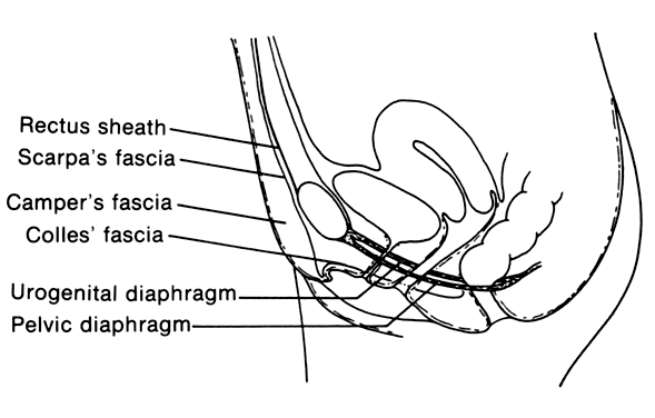 Necrotizing fasciitis is a serious infection of the superficial fascia and is associated with extensive necrosis of the superficial fascia and subcutaneous fat. The most common sites affected in the obstetric and gynecologic patient are the vulva and the anterior abdominal wall. This process starts with a simple infection of the subcutaneous tissue often associated with an abrasion or furuncle or a surgical wound. The inflammatory process then extends along superficial fascial planes (Fig. 2).9 Thrombosis of small vessels occurs, devitalizing the subcutaneous tissue and resulting in the destruction of superficial nerves. The anatomic realities of this disease explain its spread. The superficial fascia of the vulva (Camper's fascia) is contiguous with the same fascia on the anterior abdominal wall and inner thighs. In addition, this fascia comprises most of the labia majora. The deeper fascia of the vulva (Colles' fascia) is contiguous with Scarpa's fascia of the anterior abdominal wall. These planes allow the infectious process to spread from the vulva to the anterior abdominal wall and into the inner thighs. Patients with this disorder invariably have an underlying disease that impairs host immunity. Diabetes mellitus is the most common predisposing disease, but women with atherosclerosis or those who are on steroid therapy are also at risk. Rarely, necrotizing fasciitis develops in postpartum patients who have had episiotomies. Necrotizing fasciitis in the retropsoas and subgluteal spaces complicating pudendal anesthesia also has been reported. The bacterial pathogenesis of necrotizing fasciitis is polymicrobial. Aerobic and anaerobic bacteria, especially streptococci, E. coli, Clostridum sp., and Bacteroides sp., found in the genital tract can manufacture proteases that break down collagen and elastin and allow the infection to spread along tissue planes. In addition, Streptococcus pyogenes (group A streptococcus), alone or in combination with Staphylococcus aureus, is an important pathogen associated with this disease. Symptoms associated with necrotizing fasciitis include the presence of a superficial skin lesion, swelling of the affected area, and local pain followed by numbness. Patients appear acutely ill, and fever is common. Physical examination reveals skin changes that progress from an erythema to a blue-grey discoloration. Bullous changes in the skin may be present in advanced disease. During palpation of the affected area, crepitance may suggest the presence of subcutaneous gas. The hallmark of the diagnosis of vulvar necrotizing fasciitis is the presence of woody induration extending into the inner thighs. Laboratory studies usually confirm an anemia and associated leukocytosis. Patients may be hypocalcemic from the saponification of calcium in the subcutaneous tissue. X-ray examination may suggest the presence of subcutaneous gas. The mainstay of therapy for patients with necrotizing fasciitis is surgical debridement. After patients have been started on broad-spectrum antimicrobial therapy (Table 3) and resuscitated with fluids, immediate surgery is in order. The first order of business is to remove all necrotic tissue with its overlying skin. Infected tissue should be resected to bleeding edges. The deep fascia should be inspected. Do not tunnel beneath the skin to remove necrotic tissue. This approach makes continued care on the ward impossible. Leave an incision that can be unpacked and inspected on the ward. Pack the wound open with povidone-iodine-impregnated gauze. Consider observing the patient in a critical care setting if her condition warrants it. A planned second exploration of the wound in 24 hours may be considered to ensure that the infectious process has ceased to spread. Antibiotics should be continued until wound induration and the systemic signs of sepsis have disappeared. The wound should appear beefy red with granulation tissue. Continued wet-to-dry dressing changes allow many wounds to heal by secondary intention. In some cases, secondary closure or skin grafting is necessary. Consultation with a plastic surgeon may be appropriate to obtain the best cosmetic result in patients with extensive vulvar or abdominal incisions, or both. TABLE 3. Antibiotic Regimens Useful in the Treatment of Serious Obstetric