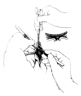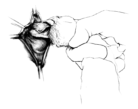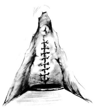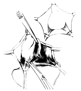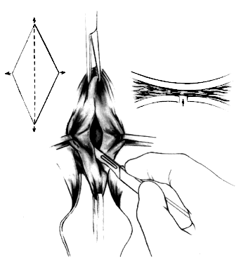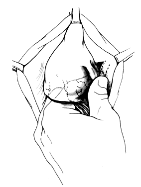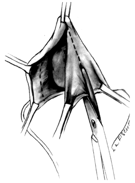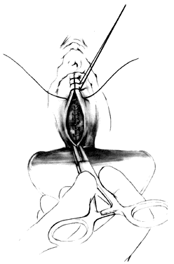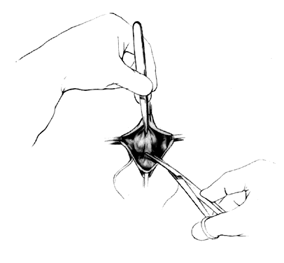 After a vaginal hysterectomy is completed, four Allis clamps are used to stretch the anterior vaginal wall into a diamond shape. With one stroke of a fresh scalpel, an incision is made through the full thickness and length of the anterior vaginal wall from just posterior to the external urethral meatus almost to the vaginal vault (Fig. 1). A scalpel is preferred because electrocautery can produce variable damage to tissues beyond the point of contact of the electrode. Tension on the four Allis clamps will cause the edges of the incision to separate readily. The bladder also can be separated from the vagina by tunneling between the two with closed scissors, a method slightly more tedious and less elegant than incision with a scalpel. The two lateral Allis clamps then are reapplied to the cut edges of the vaginal mucosa. The knife is drawn along the inner cut edge of the vaginal wall, loosening (with one or two strokes) the vesicovaginal connective tissues from the vaginal wall (Fig. 2). The surgeon's index finger, wrapped with a single layer of dry gauze, then is used to press and rotate against the vaginal flap, further separating these connective tissues (Fig. 3). As much of the vesicovaginal connective tissues as possible should remain attached to the base of the bladder. The separation of the connective tissues from the flaps of the vagina should proceed laterally only for approximately 1 inch on each side.