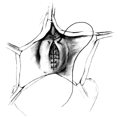 Intra-abdominal pressure usually suffices to obliterate the space between the repaired vesicovaginal connective tissues and the vaginal wall without the need to suture these structures together. A vaginal pack is used only when an anterior repair is combined with a posterior repair, to keep the opposing suture lines from adhering to each other and obliterating the vaginal canal. |