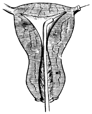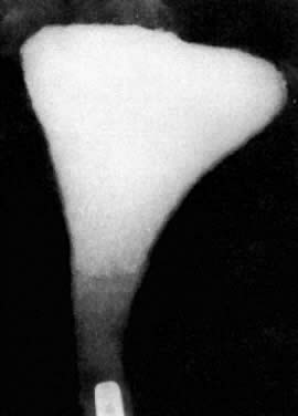 The causes of proximal tubal obstruction include salpingitis isthmica nodosa, obliterative fibrosis, endometriosis, and follicular salpingitis. Endotubal synechiae, mucus, debris, and cornual spasm can simulate organic proximal tubal obstruction. Attempts to overcome proximal tubal obstruction date from the middle of the 19th century. Metal probes were inserted transcervically until it was felt that the intramural tubal segment was reached and then presumably these probes were advanced until the “obstruction” was overcome (Fig. 2). Until the use of the HSG became a part of the infertility work-up, the diagnosis of proximal tubal obstruction could only be suspected. In this condition the intramural (interstitial) segment that connects the cornua to the isthmus usually is patent. On the HSG, the contrast material should show pointed rather than rounded ends (Fig. 3); failure of the tubes to opacify with contrast material is presumptive evidence of proximal obstruction, but tubal spasm, synechiae, and “debris” can simulate organic occlusion. In analyzing the HSG, it is important to remember that the length of the intramural segment is about the width of the thumb. A thumb placed at the cornua on the radiograph will cover the width of the myometrium (Fig. 4).11