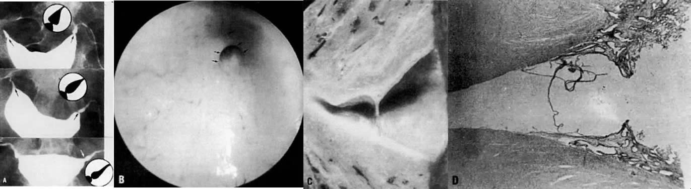 It is proper to do an infertility study that includes ovulation testing, semen evaluation, and a hysterosalpingogram (HSG) to be certain that only the tubal abnormality has caused the infertility. Contraindications to tuboplasty include a history or laboratory evidence of pelvic tuberculosis, advanced age of the woman, and recent pelvic inflammatory disease. A tuboplasty offers little chance of success in some patients with certain types of tubal abnormalities, such as those who have had a bilateral salpingectomy; those with bipolar, bilateral tubal obstruction; those with large hydrosalpinges (greater than 3 cm) and absent rugae; and those who have severe adnexal adhesions involving the ovaries. The HSG should be fluoroscopically controlled under image intensification with water-soluble contrast material. Small increments of the contrast material are injected. The end points are either tubal fill and spill, or increasing abdominal pain in the absence of tubal filling. The drainage film is essential to ascertain the presence of spill or localization, and to evaluate rugae in the distally obstructed tube (Fig. 1). The association of salpingitis isthmica nodosa with a hydrosalpinx in the same oviduct represents a contraindication to further attempts at tubal reconstruction. Laparoscopy is employed for diagnostic confirmation and possible therapeutic procedures. Other endoscopic techniques that have become a part of the evaluation of the fallopian tube include salpingoscopy3 and falloposcopy,4 the latter utilizing a linear everting catheter. |