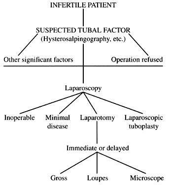 Most patients who undergo tubal reconstructive surgical procedures can be discharged within 48 hours after surgery. Morbidity is uncommon, and prophylactic antibiotics are used infrequently because there is no evidence that they improve tubal patency or pregnancy rates. Instances of femoral neuropathy have been reported,24,25 but the major postoperative complications are a tubal pregnancy and reocclusion of the previously opened tube. A patient who becomes pregnant postoperatively must be watched carefully to exclude the possibility of a tubal pregnancy. A good precaution is to assume that there is a tubal pregnancy until an intrauterine gestation is proved. During the preoperative counseling, the patient should be made aware of the increased possibility of an extrauterine pregnancy. |