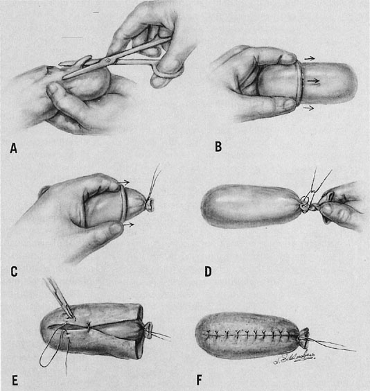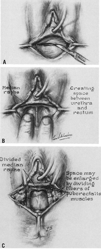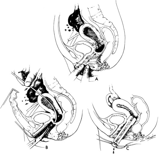 Over the past 25 years, the senior author has had experience with the split-thickness graft technique described by McIndoe to line the neovaginal space. Indications for this procedure include failure of vaginal dilation or patient preference. The Counsellor-Flor modification of the McIndoe technique uses a rolled foam rubber mold covered with a condom in place of a rigid form.11,12 The initial and important step in this operation is to obtain a satisfactory split-thickness graft. This can be easily obtained with the Padgett electrodermatome, which secures a graft 0.017 to 0.018 inch thick. The graft is also 10 cm wide and long enough to be twice the vaginal depth. The graft is taken from the buttock to render the donor site invisible, that is, within the lower limits of most bathing suits. Either buttock may be used. A transverse incision is made at the site of the vaginal orifice. The neovaginal space is developed with digital manipulation. The dissection is easily developed on one or both sides of the median raphe, where the tissue between the bladder and the rectum seems to be condensed almost enough to warrant a designation of a rectourethralis ligament (Fig. 3). The raphe is cut. This dissection should be carried to the peritoneum. However, care must be exercised not to expose too large an area of peritoneum lest an enterocele develop after the procedure. A prosthesis is then developed using foam rubber such as may be obtained from an upholstery shop. This is readily sterilized in blocks about 10 x × 10 x × 20 cm. The foam rubber may be cut to a suitable size using scissors. The form should be cut about twice the desired size and further compressed by covering with two rubber sheaths, which are ordinary condoms. Once compressed, the form is placed into the neovagina and allowed to assume the shape of the space. The end of the condom is then tied so that the proper amount of air is trapped within the foam rubber to conform to the vaginal space. The skin graft is sewn to the form with interrupted, vertical mattress sutures of fine, nonreactive suture so that the exteriorized undersurface of the graft is approximated to exteriorize the undersurface of the sutured edges (Fig. 4). After the graft has been inserted into the cavity, the edges of the graft may be sutured to the cut edges of the vaginal epithelium (Fig. 5). Only a few sutures should be placed, however, to allow drainage of any serum that may collect under the graft. Rather, large braided sutures may be placed through the labia to prevent the extrusion of the form. A suprapubic catheter is recommended to prevent urethral pressure. Postoperatively, the patient should be kept on a low-residue diet, given antibiotics, and kept at bed rest. The labial sutures may be removed in approximately 4 days, while the patient is at bed rest. Seven days after the procedure, the patient is again returned to the operating room; the suprapubic catheter is removed, and the vaginal cavity is irrigated. A second vaginal form may be molded so that the patient has two forms to use at home while the healing process is completed. Twenty-four hours after removal of the original mold, the patient is instructed in self-removal and the use of a low-pressure, clear, warm water douche. After approximately 6 weeks, the soft form is replaced with a Silastic form, which is inserted after it is moistened with tap water.