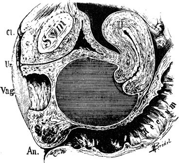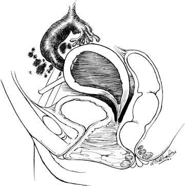 Obstructive TRANSVERSE VAGINAL SEPTUM. A transverse vaginal septum may result from a failure of complete canalization of the primordial vaginal plate or from lack of union, which represents the junction of the urogenital sinus and the paramesonephric duct contribution. A high transverse vaginal septum probably occurs at about the junction of the upper fourth and the lower three-fourths of the vagina. The etiology may lie in a local abnormality of the vaginal mesoderm or in the lack of canalization of the epithelial vaginal plate. As judged by a pedigree study of an inbred Amish community, there is evidence that a complete transverse vaginal septum may be the result of a rare female sex–limited autosomal recessive transmission.2 The site of obstruction may occur at any point along the vaginal canal, but it is most frequently at the junction between the middle and the upper thirds of the vagina (Fig. 6). The diagnosis of this condition in infancy is not easy unless a hydromucocolpos occurs. Often, an abdominal mass is noted and exploration performed. It is not unusual to observe serious urinary tract obstruction associated with the large mucocolpos. The diagnosis is difficult because there is no bulging of the outlet. The onset of symptoms usually occurs after puberty, with the onset of menstruation. Pelvic pain and pressure are primarily due to the large hematocolpos (Fig. 7). The delay in diagnosis may be considerable, approaching 2 to 3 years.18 Symptoms are associated with obstruction to the outflow of menstrual blood. In the adult, a transverse vaginal septum adjacent to the cervix is quite thick. In fact, a considerable segment of vagina may be underdeveloped, and if the segment is quite prolonged, so that it involves the lower portion of the vagina, the situation arises that is sometimes described in the literature as congenital absence of the vagina with a uterus present. This situation is considered to be an extreme form of the transverse vaginal septum. The persistent hymen should be mentioned, although it is not included as a disorder of vertical fusion. The hymen consists of a membrane separating the vaginated caudal end of the fused paramesonephric ducts from the evaginated urogenital sinus. The hymen may persist if centrally placed epithelial cells do not degenerate and produce the expected hymenal remnants. With accumulated menstrual blood, a bulge in the hymen is often recognized (Fig. 8). The hymen may be excised with a cruciate incision. When symptoms dominated by severe cyclic pain require therapy for a complete obstructing transverse vaginal septum in the lower and middle thirds of the vagina, therapy should consist of removing the obstructing membrane and reanastomosing the upper and lower vaginal segments (Fig. 9). In some instances, however, the length of the obstructing transverse vaginal septum may be such that reanastomosing the upper and lower vagina is not possible. This is particularly true when one encounters a high transverse vaginal septum (Fig. 10). In this situation, a space is created between the rectum and the bladder so as to identify the obstructed upper vagina. It is important to distinguish the mass from the bladder anteriorly and the rectum posteriorly. This identification may be facilitated by the mass, which has resulted from accumulated menstrual blood. If one cannot be certain, however, exploratory laparotomy may be performed and a sound passed through the fundus of the uterus to tent the vaginal septum and allow the operator from below to incise and resect it safely (Fig. 11). In most instances, it is possible to identify the obstructing membrane, and the operator may then probe the mass with an aspirating needle to identify old menstrual blood. The upper vagina may then be opened and the septum excised. Because reanastomosis of the vagina cannot be performed, an indwelling lucite form is placed into the vagina. This form consists of a bulbous end and a channel through which menstruation may occur. This form may be held in place with a retaining harness. In most instances, the bulbous end of the form is retained in the upper vagina. This form should be left in place for 4 to 6 months. It is anticipated that epithelialization from the lower and upper vagina will have joined by proliferation of the epithelium. Following removal of the lucite form, vaginal dilation on a daily basis may be necessary for 2 to 4 months to prevent contracture. Repair of a vaginal obstruction due to an imperforate hymen as compared with a complete transverse vaginal septum is associated with a higher subsequent pregnancy success rate (Table 5). Furthermore, pregnancy success is increased in patients with a complete transverse vaginal septum of the lower third of the vagina as compared with those with a high septum (Table 6). However, when making such a comparison between an imperforate hymen and a complete vaginal septum, one should keep in mind that the interval between the onset of symptoms and diagnosis and treatment is usually longer in patients with a complete transverse vaginal septum. It is attractive to assume that greater vaginal distention is permitted to accommodate trapped menstrual blood in patients with imperforate hymen than in patients with a high transverse vaginal septum. In fact, in patients with a high vaginal septum, only a small portion of vagina is present, and retrograde menstruation occurs early after the onset of menstruation and may predispose these patients to the development of endometriosis. Endometriosis could well explain the reduced fertility in these patients. Thus, prompt diagnosis and surgical correction to drain accumulated blood may preserve reproductive capacity by preventing this sequela.