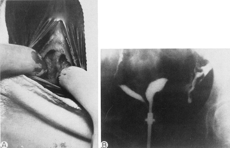 Rarely, a situation exists in which a low vaginal obstruction is associated with a lateral communication between the two horns of the uterus (see Fig. 14C). Patients may complain of a disappearing mass at the vaginal outlet. A careful hysterogram under fluoroscopy is often useful in identifying the communication. The treatment for a unilateral vaginal obstruction is the careful excision of this vaginal septum. In most instances, there is no indication for abdominal exploration. No treatment is indicated for lateral communication of the uterine horns. Reproductive performance is consistent with a double uterus unless delay in diagnosis and treatment has destroyed tubal function or resulted in significant endometriosis. Haddad and coworkers retrospectively reviewed the management of 42 patients with a blind hemivagina.30 All patients underwent laparoscopy to clarify the uterine malformation. Surgical treatment consisted of excision of the vaginal septum in 37 (88%) patients. Only one procedure was necessary in 92% of cases. Examination at 3-month assessment was satisfactory in 93% of patients. Patients also completed reproductive questionnaires an average of 6.5 years after the procedure. Nine women who had undergone vaginal septum excision experienced 20 pregnancies after the surgical procedure. The epithelium of an obstructed vagina is usually composed of cuboid cells of müllerian origin. If the obstruction is incomplete, the cuboidal epithelium is replaced with the squamous epithelium of the vagina. Thus, when the vaginal septum is removed in the obstructed circumstances, the newly opened vagina is lined with adenomatous epithelium, that is, the patient has vaginal adenosis. The adenosis epithelium is slowly replaced by a metaplastic process, which may require 2 to 3 years. In most instances, adenomatous epithelium results in an increased mucous discharge. Nonobstructive DIDELPHIC AND UNICORNUATE UTERUS. Unobstructed failure of lateral fusion involving both the uterus (didelphic) and the vagina is usually without symptoms; nevertheless, the narrowness of the vagina may result in significant dyspareunia when coitus is attempted (Fig. 15). This may require the removal of the vaginal septum. The vaginal septum is often thick. Complete resection of the septum is not necessary because the tissue often retracts and is not visible as a ridge. Generous pedicles should be taken such that hemostasis is ensured, avoiding troublesome bleeding. Reproduction is modestly compromised in patients with didelphic uteri. Unfortunately, information is anecdotal and consists of case reports or small series recording examples of primary infertility, pregnancy wastage, and premature labor. There is no indication for surgical intervention in a didelphic condition except for removal of a vaginal septum that might cause dyspareunia.