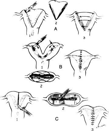 It is necessary to distinguish between the bicornuate and the septate uterus because the bicornuate uterus is infrequently associated with reproductive difficulty, whereas the septate uterus is frequently associated with reproductive failure. The distinction between these two types of uteri cannot be made by examination of a hysterogram: The image of the cavities may be exactly the same. With the bicornuate uterus, two distinct horns are observed; with a septate uterus, the exterior configuration of the uterus is normal. Although the diagnosis of müllerian anomalies traditionally has been made with the use of hysterosalpingogram, sonogram, diagnostic laparoscopy, and occasionally, laparotomy, magnetic resonance imaging (MRI) has been shown to be useful in characterizing and delineating more clearly the exact nature of the müllerian defect.31 There have been no studies attempting to clarify the reasons why some double uteri cause reproductive loss wherea others provide a series of normal pregnancies. It has been suggested that increasing intrauterine pressure with relative cervical incompetence may be responsible for premature delivery, whereas habitual abortion may be the result of a poor blood supply to the endometrium through the septum.32 It has also been suggested that the luteal defect associated with a double uterus may be a result of the local vascular insufficiency and not a hormonal deficiency. The etiology of reproductive failure in patients with a double uterus awaits further study by histologic techniques of various parts of the endometrium with hormonal correlation and the use of blood-flow studies. Until this is done, identification of the double uterus that causes difficulty may be made only after the fact by clinical trial. A small percentage of patients with a symmetric double uterus have abnormalities of the urinary tract; 9% of patients with a double uterus have been noted to have congenital absence of a single kidney.33 As a rule, the more severe the uterine anomaly, the more likely an anomaly of the urinary tract. Urologic evaluation is recommended for all patients with a double uterus. As only one in five patients with a double uterus will have reproductive loss as a result of the uterine anomaly, a complete evaluation for habitual abortion should be performed.33 This should include an endometrial biopsy and karyotypic analysis. Further studies, as indicated by history, should include thyroid-stimulating hormone, thyroid profile, mycoplasma culture, and antibody titers for toxoplasmosis, herpes, and cytomegalic inclusion disease. Uterine unification as treatment for repeated pregnancy loss should be attempted only after a complete and thorough evaluation. The history of the miscarriage is particularly significant. A characteristic story is that of an early midtrimester loss associated with a minilabor starting with cramps and followed by bleeding. In miscarriages that occur in the first trimester, when there is a history of lack of recognition of an embryo, it is necessary to suspect that the cause is other than the anatomic defect of the uterus. Nevertheless, histories that differ from the typical one described previously are sometimes encountered. When a correctable endocrine or metabolic cause of reproductive loss is identified, it should be corrected before any surgical procedure is considered. When the double uterus is the only factor associated with repeated pregnancy loss, surgical correction may be performed. Several authors have presented concerns with reference to the type of metroplasty for a particular uterine anomaly. Technical simplicity, vascularity of the incision, trauma to the remaining myometrium, soundness of the uterine scar, and interference of subsequent uterine activity have been stressed. The suggestion that little or no myometrial tissue be removed with the repair has also been emphasized. There are three principal types of abdominal procedures (Fig. 17).34,35,36 Modifications of these procedures are numerous, each claiming some advantage. Our own experience has been exclusively with excision of the septum by wedge. Excessive blood loss should not present a problem with any unification procedure with the injection of a dilute solution (20 units in 20 mL saline solution) of vasopressin (Pitressin) into the myometrium. The wedge technique invariably results in a small reduction in the size of the uterine cavity. However, this does not appear to interfere with subsequent pregnancy success. Several points should be emphasized in performing a wedge metroplasty (Fig. 18):