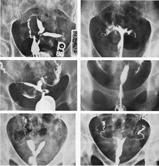Obstructive OBSTRUCTED UTERINE HORN. Disorders of lateral fusion result from a failure of lateral fusion of two müllerian ducts. In addition, on one side, there is failure of the lumen to communicate with the outside. At times, an obstruction may involve an isolated horn of the uterus with minimal connection to the unobstructed side (Fig. 13). These patients usually present with signs and symptoms suggestive of an ectopic pregnancy. Early removal is desirable so that retrograde menstruation will not cause endometriosis and compromise subsequent reproduction. Fortunately, in some instances of a rudimentary horn with obstruction, there is also a failure of communication of the cavity of the uterus with the fallopian tube so there is no opportunity for spill of menstrual blood. The excision of these horns gives complete relief of symptoms. DOUBLE UTERUS ASSOCIATED WITH AN OBSTRUCTED HEMIVAGINA AND IPSILATERAL RENAL AGENESIS. The unique clinical syndrome of double uterus, unilateral partial or complete obstruction of the vagina, and ipsilateral renal aplasia is rare (Fig. 14; see Fig. 13). The clinical presentation varies depending on the uterovaginal relationships, which may obscure the true diagnosis. Three groups of patients have emerged from a review of our own experience (Table 7).29 Group 1 consists of patients with a complete unilateral vaginal obstruction without uterine communication, which results in a perivaginal mass with severe dysmenorrhea, lower abdominal pain, and regular menses. Group 2 consists of patients with incomplete unilateral vaginal obstruction without uterine communication. These patients have lower abdominal pain, severe dysmenorrhea, excessive foul mucopurulent discharge, and intermenstrual bleeding. Group 3 patients have complete vaginal obstruction with a laterally communicating double uterus. They have a perivaginal mass, lower abdominal pain, dysmenorrhea, and regular menses. Irregular menstrual bleeding usually confuses the physician such that unless she or he thinks of the possibility of the diagnosis, the diagnosis may be overlooked. A hysterogram, intravenous pyelogram, and careful pelvic examination often allow the diagnosis to be made. When there is complete unilateral obstruction, a large amount of blood may accumulate, and this condition may go unrecognized for a number of years after the onset of menstruation. This is due primarily to a distensible vagina that can accommodate to the increments of blood resulting from each menstrual cycle. Absorption of enough menstrual blood occurs between periods so that succeeding flow may add to the accumulated blood without pain. Nevertheless, once retrograde menstruation occurs, endometriosis invariably results. Thus, if the septum may be removed before the tubes and ovaries are compromised by infection or endometriosis, reproduction may be consistent with uterine duplication without obstruction.
