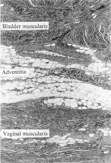 The logical reconstructive materials to consider are the patient’s own tissues. For many years, gynecologic surgeons have relied on a variety of endogenous materials, including uterosacral ligaments, pelvic fascia, skin, muscle, and locally available connective tissue. These tissues may be used in their current location (e.g., uterosacral ligament suspension of vaginal apex) or moved to a new location for an alternative use (rectus fascia for suburethral sling). These materials are biocompatible and easy to use. The scientific evidence for their long-term durability varies. There are no randomized clinical trials comparing endogenous sources with other materials for reconstructive gynecologic surgery. The uterosacral ligaments are probably the most used endogenous material for vaginal suspension. Every hysterectomy and many posthysterectomy vaginal support techniques rely on these native tissues. Several authors have studied the histologic components of this tissue, which is found to be composed of elastic, collagen, and smooth muscle fibers with scattered blood vessels.9 The term uterosacral ligament is a misnomer because these are not “ligaments” in any traditional sense given their composition of irregular connective tissue and abundant smooth muscle with its attendant autonomic nerve supply. Observant surgeons recognize how fleeting their form is when they are cut at the time of surgery. Their ligamentous appearance is secondary only to the anatomic tension of their environment. Surgeons selectively acknowledge the innervation of the uterosacral ligaments. Most commonly, these structures are transected and sewn without thought to the neural consequences. Certain surgical procedures use the opposite approach. During procedures to ablate midline pelvic pain, the uterosacral ligaments are transected or destroyed without regard to long-term vaginal support. Vaginal fascia has been discussed in gynecologic operating rooms for more than 100 years, typically during anterior colporrhaphy. The histologic components of this material have been studied by Weber and Walters,10 who examined full-thickness sections of the bladder and vagina from autopsy specimens. Histologic examination confirmed that there is no vaginal “fascia”; rather the tissue between the vaginal mucosa and the bladder muscularis consists only of vaginal lamina propria and vaginal muscularis (Fig. 1). This layer is plicated during traditional anterior colporrhaphy. The histologic components of this tissue may help explain the relatively low anatomic success rates of anterior colporrhaphy. A layer that contains bladder adventitia and muscularis does not have the optimal biomechanical properties for long-term, durable anterior vaginal wall support. At the very least, this material is different from traditional fascia (rectus or fascia lata) and should not be considered to have similar biomechanical properties.