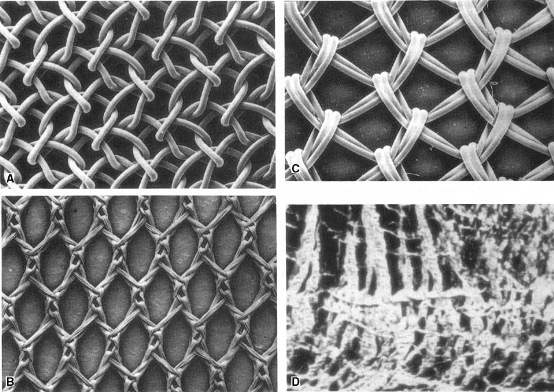 Native tissues have tremendous advantages and should be used whenever they are likely to accomplish the surgical reconstruction goals. As all surgeons are aware, however, the strength of native tissues can be insufficient. It is tempting to substitute stronger, more durable materials to enhance outcomes. One high-quality randomized trial compared inguinal hernia repair with synthetic mesh with careful repair of endogenous fascia using permanent sutures.42 There were high recurrence rates in both groups but an excess recurrence rate when sutures only were used without additional mesh (sutures 43% versus mesh 24%). This study also compared these materials for repeat hernia repair. The difference was more striking with a 58% recurrence for sutures only versus 20% with mesh. Even healthy endogenous materials may have insufficient biomechanical properties to compensate for abnormal physiology. Reconstruction has long depended on synthetic materials, and a large variety of synthetic materials are available for use by gynecologic surgeons. The ideal surgical mesh would be chemically inert, biologically inactive, strong, flexible, convenient, and cheap—this ideal mesh currently does not exist. Available meshes differ as follows: