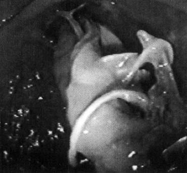 Mesh preparation chemical polymers are manufactured into filaments that create the individual fibers (monofilament) or yarns (multifilament). These fibers or yarns ultimately are woven in to mesh material that is unique to each brand-name mesh. Polypropylene is used to created Prolene, Marlex, and Surgipro meshes. Prolene is also a monofilament mesh with macropores. In its typical mesh formation, it is stiff, although there is additional flexibility in its preparation for use as a transvaginal tape. This highlights the difference between the chemical composition of the fiber itself and the gross properties when those fibers have additional processing and gross physical arrangement. Marlex is stiff, macroporous mesh with irregular pore sizes. It is probably suited poorly for placement on flexible body surfaces, such as the vagina. Polyethylene terephthalate is the material that is woven to compose Mersilene mesh. Typically this mesh is prepared in a hexagonal weave with the use of multifiber filaments. It is a macroporous mesh with directionality that can be shown easily by pulling the mesh by its width versus its length. This gross characteristic is important in determining proper orientation to limit mesh stretch after reconstructive surgery. Expanded polytetrafluoroethylene polymers are used to form a Gore-Tex mesh. Because there is no weaving involved, this mesh has a smaller pore size than either Mersilene or Prolene. This small pore size may contribute to the fact that fibrocollagenous infiltration of Gore-Tex mesh does not occur after implantation, and minimal inflammatory response to the mesh occurs.47,48 There is a negative side to the use of synthetic meshes in the pelvis. Although mesh is believed to augment surgical success rates, complications related to rejection and erosions are significant. In the course of 40 years of synthetic use, erosions into the urinary tract, bowel (large and small), and vagina have been reported (Table 5).46,49,50,51,52,53,54 Symptoms of mesh erosion typically include a persistent vaginal discharge that may be blood-tinged at times. More commonly, mesh exposure is detected when the patient is asymptomatic. One case report details asymptomatic rectal erosion and ultimate graft passage without sequelae (Fig. 5). Early efforts at full extirpation are probably overzealous and should be avoided. Expert opinion suggests that in the absence of sinister symptoms, early mesh erosions can be managed conservatively with periodic observation. A few surgeons have reported techniques for management of mesh complications,51,55 including transvaginal revision, transvaginal removal, laparotomy, and laparoscopy with removal.