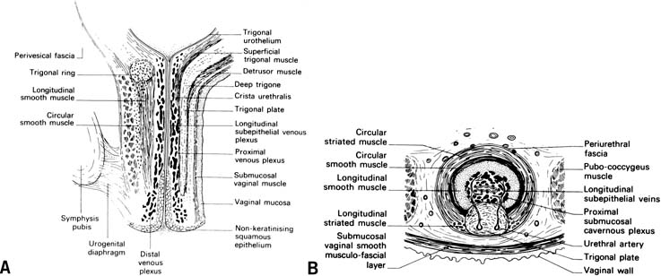 The continence mechanism of the lower urinary tract relies on a complex interaction of anatomy, tissue integrity, and nerve reflexes. The purpose of the urethra is to provide a conduit from the bladder to the outside. Essential anatomic elements to continence include proper mucosal apposition, constant urethral tone, and maintenance of the bladder neck/proximal urethra in the retropubic position. The mucosa and submucosa of the urethra contain an extensive submucosal venous plexus that forms a cushion to keep the urethra closed at rest (Fig. 1). Two layers of smooth muscle, an inner longitudinal and outer circular layer, surround the mucosa. The longitudinal layer serves primarily to shorten the urethra during micturition, but the circular layer adds further to the urethral tone. The striated urethral sphincter, also termed the urogenital sphincter, surrounds the inner layers and is composed of three elements located in the mid part of the urethra: the rhabdosphincter, the compressor urethrae, and the urethrovaginal sphincter (Fig. 2). These striated muscles are under voluntary control but are subject to reflex arcs, with the three portions acting as a functional unit. This sphincter contributes to the resting tone of the urethra as well as to continence during stress, acting primarily as a back-up mechanism in those with hypermobility of the urethrovesical junction. With a sudden increase in intra-abdominal pressure (i.e., coughing, sneezing), reflex contraction of this sphincter aids in continence. Pelvic floor training (Kegel exercises) can increase the efficacy of these muscles both in strength and duration of contraction. The muscular and fascial attachments of the urethrovaginal junction (UVJ) or bladder neck keep this crucial area in an intra-abdominal position. The proximal two thirds of the urethra and the UVJ are fused to the anterior vagina, with the underlying endopelvic fascia forming a hammock of support. This hammock under the UVJ helps proximal urethral closure during increased abdominal pressure and extends laterally to the arcus tendineus fascia pelvis and the levator muscles.9 The tone of the levator ani pelvic muscles maintains the UVJ in the retropubic intra-abdominal position at rest and allows descent and funneling during relaxation for micturition. Contraction of the levator ani during stress prevents movement of the supportive hammock which acts as a backstop for urethral closure (see Fig. 2). Alterations in pelvic innervation can affect the internal smooth muscle sphincter and the striated sphincter, as well as the levator tone and normal reflexes. Disruption of the normal anatomic supports of the hammock can allow excess rotation of the UVJ with physical stress, resulting in impaired transmission of pressure to this area. The increased pressure on fluid in the bladder overcomes the lower pressure in the urethra, allowing urine to escape (Fig. 3). Additionally, abnormal anatomy and hypermobility may compromise the effectiveness of compensatory mechanisms such as the striated urethral sphincter and/or put further stretch on branches of the pudendal nerve, further impairing function. A poorly functioning urethra can also contribute to or be the primary cause of SUI in patients. Patients with this condition were previously described as having intrinsic sphincteric deficiency (ISD) or type III incontinence. An atrophic urethral mucosa, a scarred or fibrotic submucosal layer, a poor venous plexus, and/or impaired smooth muscle function can prevent normal apposition of the urethral mucosa. This loss of the normal tissue elastic properties from multiple surgeries, aging, estrogen deficiency, or radiation can impair normal coaptation and pressure transmission in the urethra, resulting in urine loss with minimal exertion. Importantly, patients may have some degree of a poorly functioning urethra working in concert with deranged anatomy or nerve injury, with all factors contributing to stress incontinence. When these urethral characteristics manifest in a severe form, descriptive terms such as low-pressure urethra, lead-pipe urethra, or patulous urethra have been used. Although the condition of ISD with defining diagnostic criteria is still debated, a urethra with these characteristics but with intact support (i.e., immobile) helps determine specific therapies as discussed later. |