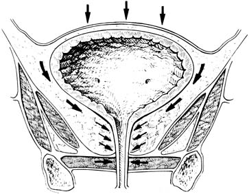 More than 200 procedures have been described in the literature for the treatment of stress incontinence. This extraordinary number reflects a combination of the alteration of techniques and approaches of established and effective procedures, the introduction of newer technologies and materials, as well as the discarding of procedures shown to be less efficacious. In today's surgical practice, it is well-established that performing an anterior repair or Kelly plication for the treatment of SUI is substandard compared to more effective procedures.33 Because of significant recurrence rates at even 1 and 2 years of follow-up, long-needle procedures such as the Peyera, Stamey, or Raz procedures, and their other modifications have also decreased in popularity over the recent years. Currently, the two primary forms of surgery for SUI remain the retropubic urethropexy and sling procedures. Injection of urethral bulking agents also is performed as a less invasive intervention for SUI in certain patients. Retropubic Urethropexy The gold standard surgical treatment of SUI in patients with a hypermobile bladder neck but otherwise normally functioning urethra has been accomplished through a retropubic approach (Fig. 9). The two procedures most studied are the Burch retropubic urethropexy and the Marshall-Marchetti-Krantz (MMK) procedure. In a Burch procedure, permanent sutures are placed lateral to both sides of the mid urethra and UVJ into the fibromuscular layer of the vagina (avoiding full thickness) and fixed to the ipsilateral Cooper's ligament for a total of four sutures. Attachment to the fibrocartilage of the symphysis pubis is performed for the MMK. Placement of these sutures is aimed at reestablishing the intra-abdominal location of the proximal urethra and UVJ and to minimize descent, thus allowing normal pressure transmission to this crucial area during times of stress. Cure rates for these procedures range from 85% to 90% at 1 to 5 years, and most 10-year data with more than a 70% cure rate.34,35 Traditionally, this procedure can be performed in concert with an abdominal hysterectomy or alone, through a retropubic approach without opening the peritoneal cavity. With the increased trend toward minimally invasive surgery, methods for laparoscopic urethropexy have been developed. Besides either an intraabdominal or an extraperitoneal approach, numerous modifications have been suggested including using only two sutures, substituting mesh, or using tacks, anchors, and other tools to elevate the bladder neck. These variations significantly lower cure rates as compared with traditional open urethropexy. Placement of four permanent sutures identical to an open procedure, though, has yielded similar 1- and 2-year cure rates as an open Burch (93% and 89%, respectively),36 although no prospective trial between abdominal and laparoscopic Burch procedures has been published. Currently, it is our practice to place four sutures identical to the open procedure when using a laparoscopic approach for optimal results. Transvaginal placement of urethropexy sutures has also been reported in small numbers, but no RCTs demonstrating comparable efficacy have been performed.37 Suburethral Slings Placement of a sling under the bladder neck and proximal urethra had traditionally been used for patients with severe incontinence and poorly functioning urethras, and for those with recurrent stress incontinence. More often, though, suburethral slings (SUS) are being used as treatment for primary stress incontinence, an approach advocated by some urologists.38,39 The debated increase in morbidity, specifically urinary retention and urge incontinence, as compared with urethropexy is the point of contention regarding primary use of this procedure for treatment of SUI.40 Intermediate (1 to 2 years) and long-term (2 to 10 years) cure rates of 85% to 90% and 70% to 85%, respectively, are cited in the literature for most slings.39,41 In general, SUS can be considered full-length slings extending from rectus fascia all the way around the bladder neck and back up to the contralateral rectus fascia, or patch slings that use suture bridges that are tied over or sutured to the fascia. Full-length autologous slings can be obtained by harvesting fascia either from the rectus sheath or from the fascia lata of the leg. The sling is usually sutured into place with delayed absorbable sutures under the bladder neck. The tails of the full-length slings are sutured to the rectus fascia directly with good care to keep the sling loose. Similarly, the permanent suture bridge of patch slings is tied over the fascia or to the fascia loosely to protect against overcorrection and outlet occlusion. The two slings described are the most common types of autologous slings cited in the literature. Other less-proven autologous materials include vaginal wall slings and rectus abdominus slings. Cadaveric fascia lata, dermal allograft, porcine dermis, and porcine small intestinal submucosa are other sources of nonsynthetic sling material. Synthetic slings, used as either full-length or patches, include Mersilene, Marlex, Prolene, Gore-tex, and silastic bands. Some of these novel materials have used bone anchors or other minimally invasive means to place a sling under the bladder neck, although long-term data regarding efficacy of these modifications, as compared with traditional slings, remain lacking. A variation of the classic sling was developed in Europe by Ulmsten and colleagues using a Prolene mesh placed under the mid urethra (Fig. 10).42 The increasingly popular tension-free vaginal tape (TVT) and its subsequent competitors (Sparc, Uretex) were developed as a minimally invasive outpatient procedure that can be performed under intravenous sedation and local anesthesia. Placement of the mesh is accomplished through a small 1- to 2- cm incision under the mid urethra with blind passage of delivery needles up behind the pubic bone and through two small