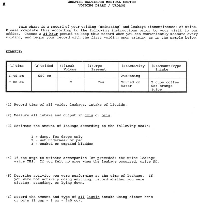 The Agency for Health Care Policy and Research (AHCPR) published its consensus guidelines for the evaluation and management of urinary incontinence in 1996.10 These recommendations from a panel of experts include the following: a thorough history (including voiding diary), physical examination, postvoid residual, and urinalysis. Described here are these basic elements with other potential tools that may also help determine the best mode of treatment. History Patients with stress urinary incontinence have a history of urine loss during physical stress such as coughing, laughing, sneezing, running, and lifting. Other features important to ascertain include the time of onset, progression or remission of symptoms (especially in relation to parturition), and frequency of leakage. Indications of severity can be garnered from number of pads used per day and interference or cessation of both physical and social activities. Determination of urinary frequency, nocturia, and presence or absence of urgency, urge incontinence, and nocturnal enuresis are essential to exclude overactive bladder or mixed incontinence. Previous surgeries, medical conditions, obstetric history, and a list of medications should be elucidated. Completion of a 24-hour or, more ideally, a 72-hour urolog (urinary diary) before the appointment gives extremely valuable information validating symptoms. This urinary diary should contain micturition frequency, leak episodes, pad use, voided volume, and volume of fluid intake (Fig. 4).