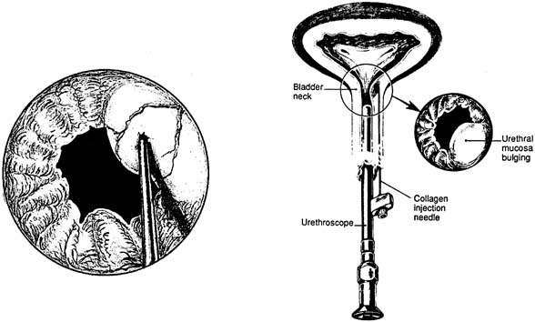 Other Treatments Placement of artificial urethral sphincters tends to be performed by urologists in patients who have not had symptoms cured by other aforementioned interventions. Most of these devices involve an occlusive cuff placed around the proximal urethra that is fed by a reservoir situated in the labia majora for patient control. Consensus regarding suitable patients and efficacy is still in question because of small cohort studies and poor standardization. A success rate of between 80% and 90% is most quoted, but a significant rate of revision, explantation, or erosion of 5.9%48 to 17%49 has been seen. A different, minimally invasive, treatment modality being developed involves radiofrequency thermal energy to cause tissue shrinkage at the bladder neck (SURx; Thermatrx). This procedure, performed as an outpatient procedure by a laparoscopic or vaginal approach, is designed to cause scarring at the bladder neck to restrict mobility. In a single small study of 94 women who underwent the laparoscopic procedure,50 subjective improvement, and cure rates, as well as objective cure (negative stress test) were seen in approximately 80% of patients. Further studies and longer follow-up are obviously needed. |