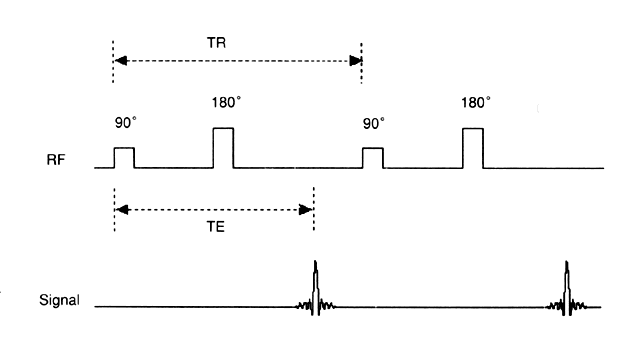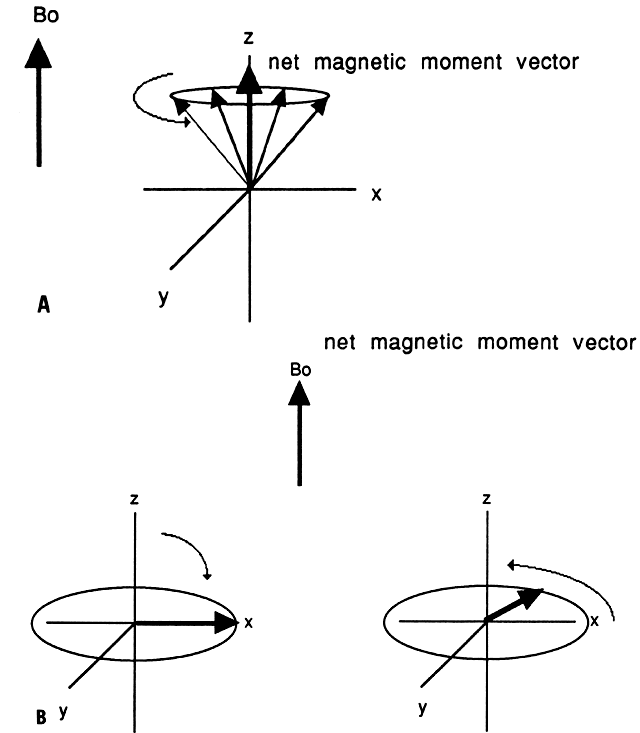 Nuclear Spin Certain atomic nuclei in molecules possess nuclear angular momentum, or spin. Such nuclei may be considered as spinning charged particles that create a magnetic field or moment (μ). 1H, 31P, 13C, 15N, and 19F are nuclei with spins. 1H nucleus, the proton, is currently the only nucleus extensively used for MRI because of its relative abundance in the human body; therefore, it will be the focus of the remainder of this discussion. In the absence of an external magnetic field, individual hydrogen nuclei are randomly oriented within a tissue. When a uniform external magnetic field (B0) is applied to these nuclei, the nuclei tend to align in the direction of the applied field because this is the lowest energy state. The aligned nuclei will spin, or precess, about E0 at a frequency that is determined by the strength of the magnetic field being sensed by the nuclei—that is, the larger the external magnetic field, the higher the frequency of precession. The magnetic moments of multiple similarly aligned nuclei produce a net magnetic moment that is used to produce the MRI signal (Fig. 1A). Alignment in a direction opposite to the external magnetic field requires nuclei to be in a higher energy state. The quantity of energy required to transform the proton to its higher energy state is determined by quantum mechanical principles and is directly related to the precession frequency of the proton. Such transfer of energy may be achieved by applying an electromagnetic field (B1) (which for imaging is in the range of RF wavelengths) orthogonal to the main magnetic field (B0). The net magnetic moment vector will rotate about the original magnetic field, the degree of rotation being determined by the strength and duration of the applied electromagnetic field. Assuming E0 to be oriented in the Z direction, then the net magnetic moment is usually rotated 90°, thus placing the net magnetic moment vector into the X-Y plane perpendicular to the direction of E0 (Fig. 1B). When the electromagnetic field is discontinued, the net magnetic moment vector precesses in the X-Y plane. This precession of the net magnetic moment vector is also known as transverse magnetization. This precession in the transverse plane, the X-Y plane, will induce a voltage within coils or loops of wire that are aligned with the transverse plane. This induced voltage is then translated into a signal that results in a magnetic resonance image. It is the ability of MRI to assess variations in the net magnetization of the nuclei within different tissues that allows for superb tissue contrast, a unique feature. These variations in net magnetization decrease exponentially over time and are characterized by T1 and T2 relaxation times that are unique to the specific tissue. These relaxation times are explained in the paragraphs that follow. T1 Relaxation After electromagnetic excitation, nuclei absorb energy and a higher percentage of the nuclear population exists at a higher energy state. By transferring this energy from the excited nuclei to surrounding molecules, commonly referred to as the lattice, the nuclei return to a lower energy state, realigning with the main magnetic field (B0). This return to the low energy state is called T1 relaxation or spin lattice relaxation. The efficiency with which energy is transferred depends on the molecular structure of the surrounding tissues (i.e., relaxation of protons in fat would differ from relaxation of protons in muscle). The transfer of energy is described by an increasing exponential function in which the time constant (i.e., the time at which 63.7% of the previously displaced spins realign with the main magnetic field) is the T1 relaxation time. Shorter T1 relaxation times imply faster realignment with the main magnetic field after excitation. T2 Relaxation After excitation, the nuclei initially precess coherently within the X-Y plane. However, as a result of local fluctuations in the magnetic field caused by nearby nuclei, energy is transferred from one nucleus to another. This transfer of energy results in loss of phase coherence. Macroscopically, the net magnetic moment vector decreases, resulting in a smaller signal. T2 relaxation describes this loss of phase coherence or transverse magnetization. It is also known as spin-spin relaxation, because energy is transferred from one excited spin (nucleus) to another and not to the lattice as in T1 relaxation. This transfer of energy is characterized by an exponential decay function in which T2 relaxation is the time necessary to lose 63.7% of the signal. T2 relaxation typically occurs more rapidly than T1 relaxation and is the primary cause of the exponential decay in transverse magnetization. Spin-Echo Imaging Because of imperfections in the main magnetic field, nuclei lose their phase coherence (i.e., their ability to precess in synchrony with surrounding nuclei), and transverse magnetization decreases more rapidly than anticipated based on known T2 relaxation values of a sample tissue. It can be shown that a 180° RF pulse applied at some time after the 90° RF excitation can re-establish phase coherence. The time phase coherence that is re-established is called the echo time (TE), and the use of a 90° excitation pulse followed by a 180° RF pulse is known as a spin-echo sequence (SE). The signal generated from such a sequence approximates the signal anticipated based on the tissue T2 relaxation times (Fig. 2). To produce an image with a resolution of 128 by 128 pixels, the entire procedure for excitation and signal acquisition must be repeated at least 128 times. For typical areas imaged in the pelvis, this technique yields resolution in the range of 1 mm to 4 mm. In spin-echo imaging, the time from the application of the first 90° RF pulse to the application of the next 90° pulse is called the repetition time (TR). Spatial Localization To produce a magnetic resonance image, a signal must be generated and localized. The sci